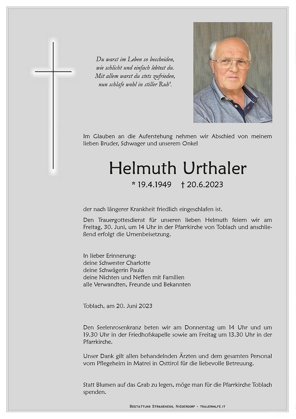 Trauerfeier: 30.06. - 14:00 Uhr Toblach
