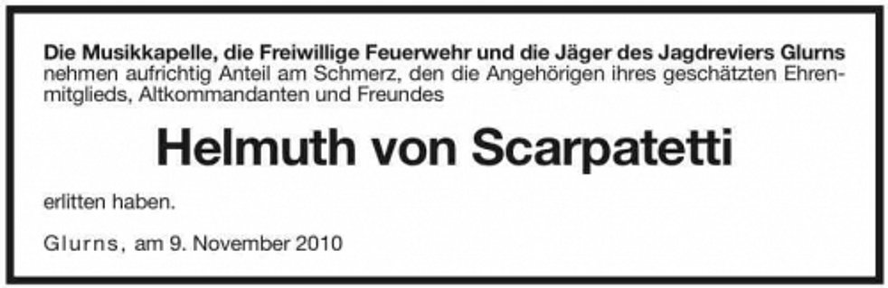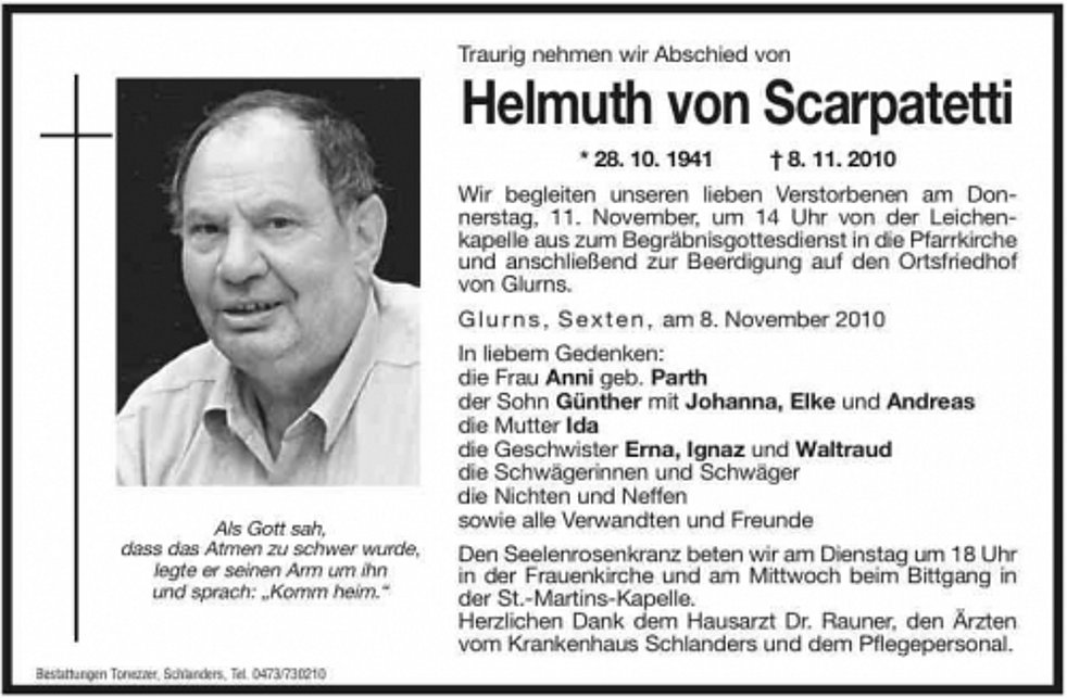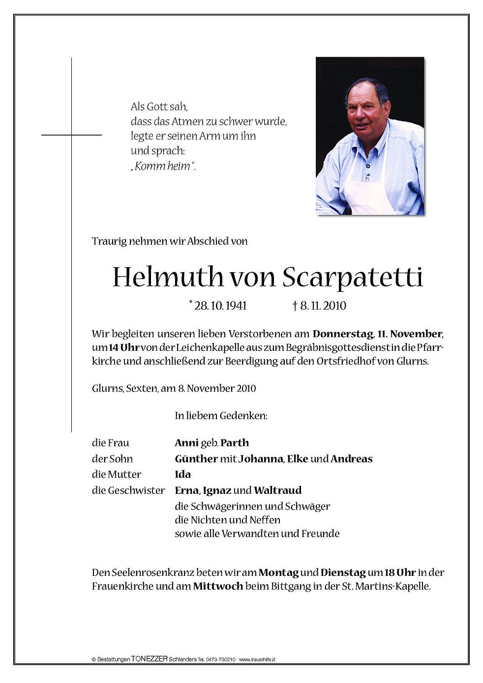 Wir begleiten unseren lieben Verstorbenen am Donnerstag, 11. November, um 14 Uhr von der Leichenkapelle aus zum Begräbnisgottesdienst in die Pfarrkirche und anschließend zur Beerdigung auf den Ortsfriedhof von Glurns.