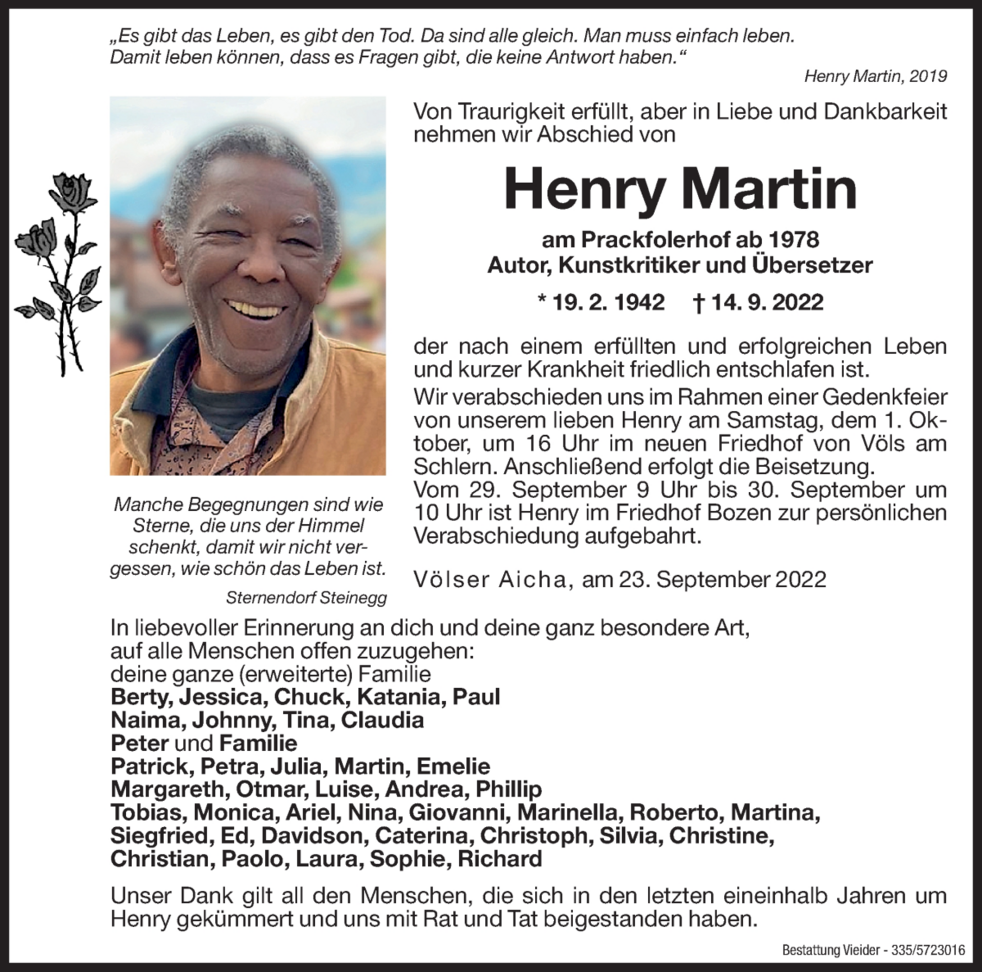 Wir verabschieden uns im Rahmen einer Gedenkfeier von unserem lieben Henry am Samstag, dem 1. Oktober, um 16 Uhr am neuen Friedhof von Völs am Schlern. Anschließend erfolgt die Beisetzung.