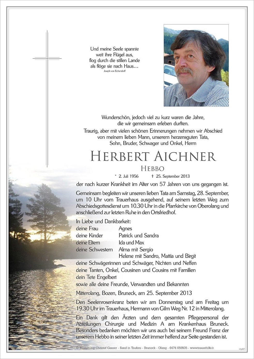 Ein Dank gilt den Ärzten und dem gesamten Pflegepersonal der Abteilungen Chirurgie und Medizin A am Krankenhaus Bruneck. Besonders bedanken möchten wir uns auch bei seinem Freund Franz der unserem Hebbo in seiner letzten Zeit immer helfend zur Seite gestanden ist.