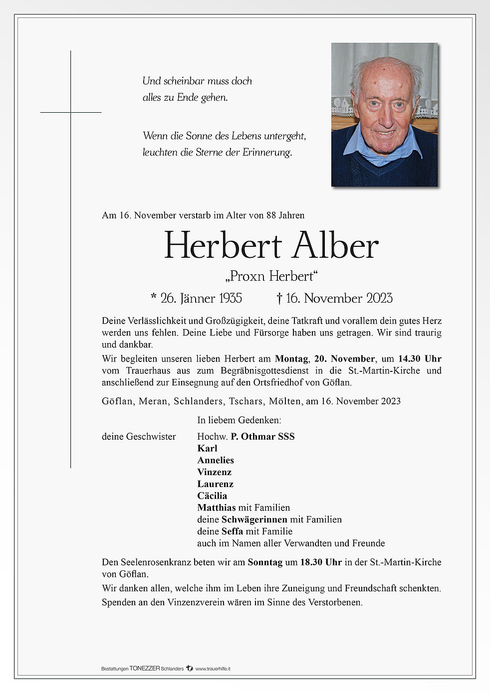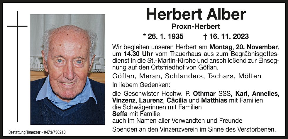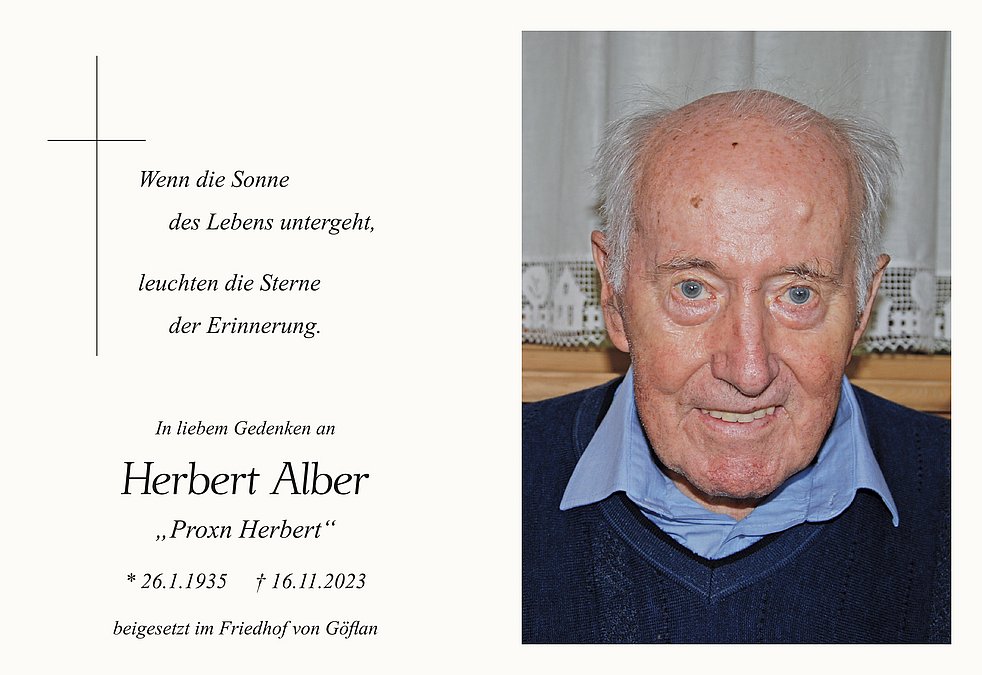 Wir begleiten unseren lieben Herbert am Montag, 20. November, um 14.30 Uhr vom Trauerhaus aus zum Begräbnisgottesdienst in die St.-Martin-Kirche und anschließend zur Einsegnung auf den Ortsfriedhof von Göflan.