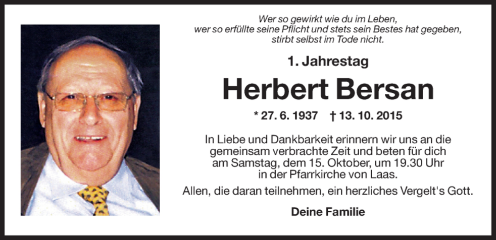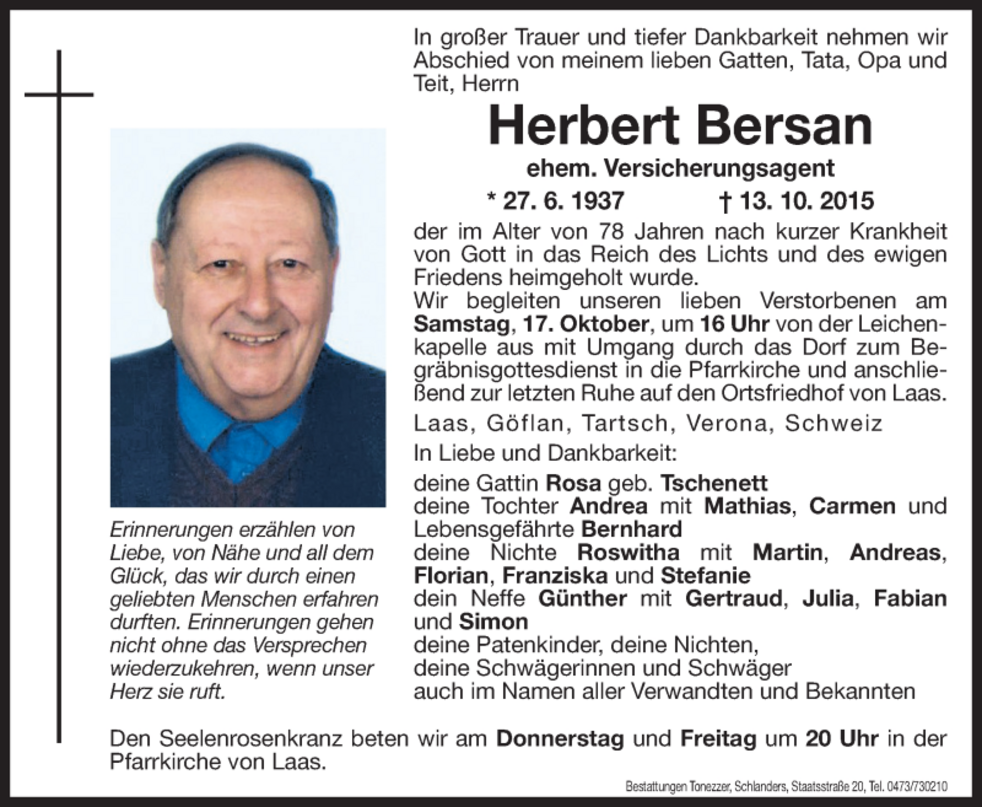 Wir begleiten unseren lieben Verstorbenen am Samstag, 17. Oktober, um 16 Uhr von der Leichenkapelle aus mit Umgang durch das Dorf zum Begräbnisgottesdienst in die Pfarrkirche und anschließend zur letzten Ruhe auf den Ortsfriedhof von Laas.