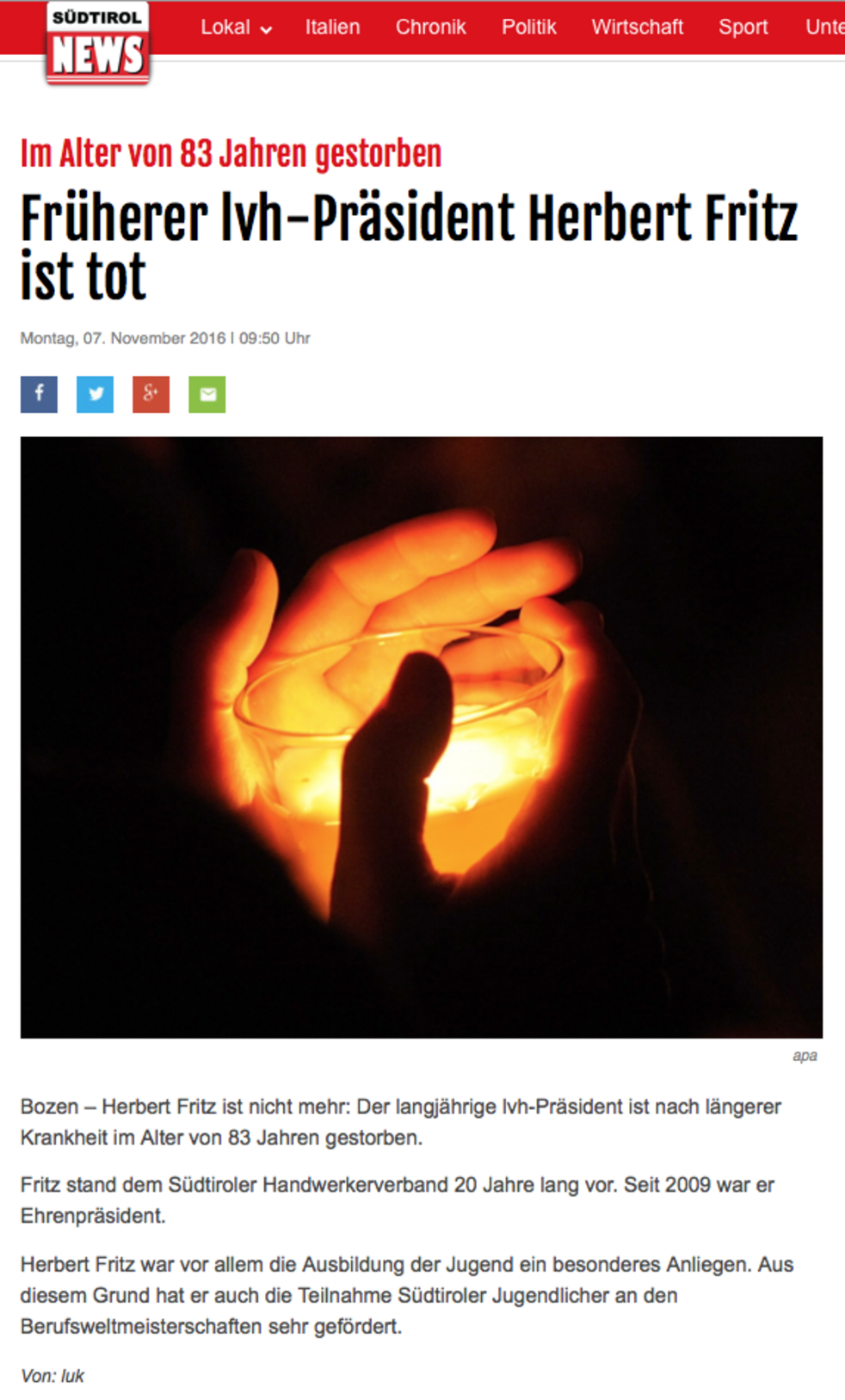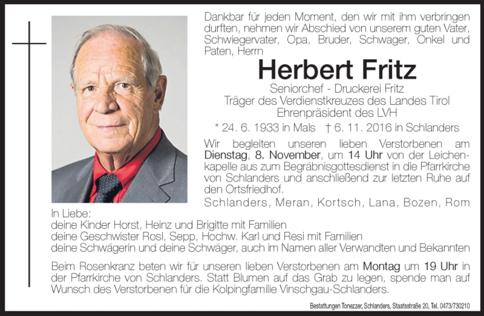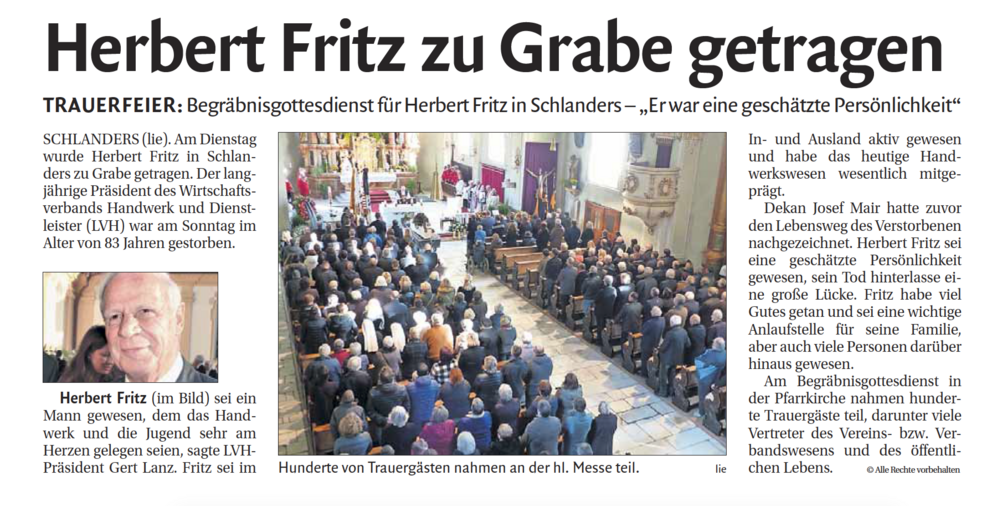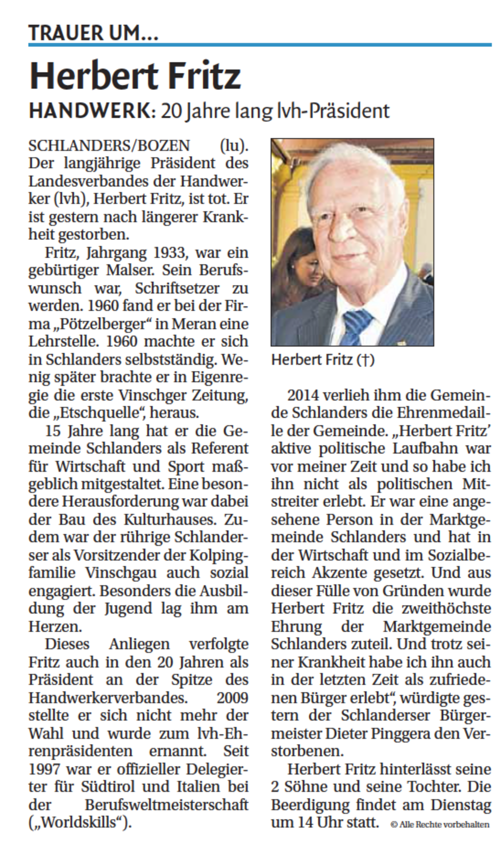 Statt Blumen auf das Grab zu legen, spende man auf Wunsch des Verstorbenen für die „Kolpingfamilie Vinschgau-Schlanders“.