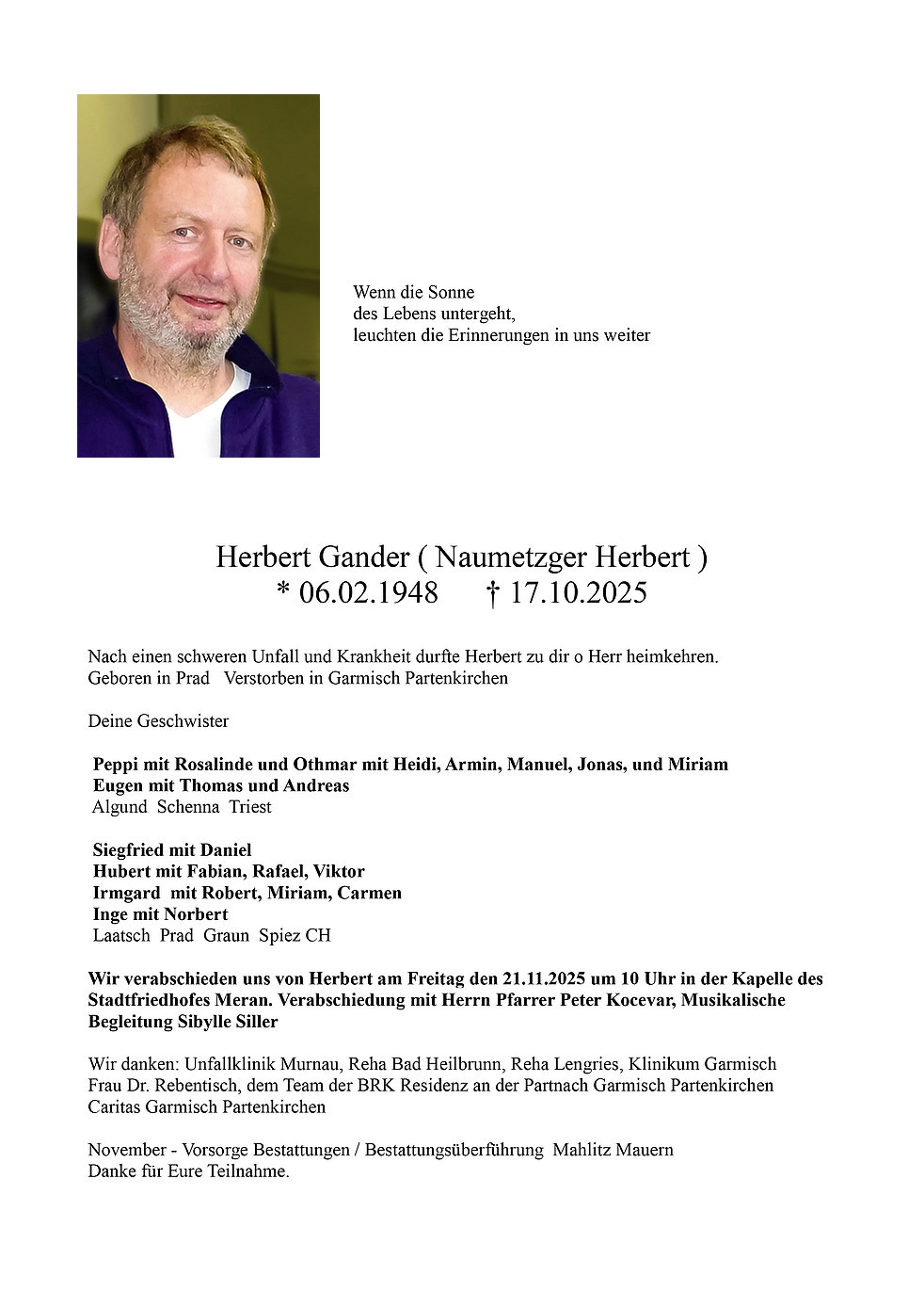 Verabschiedung: 21.11. - 10:00 Uhr in der Kapelle des Stadtfriedhofes Meran