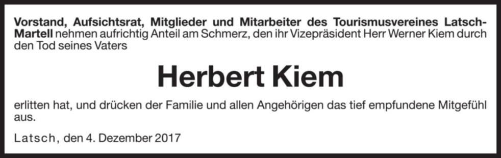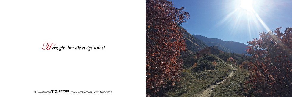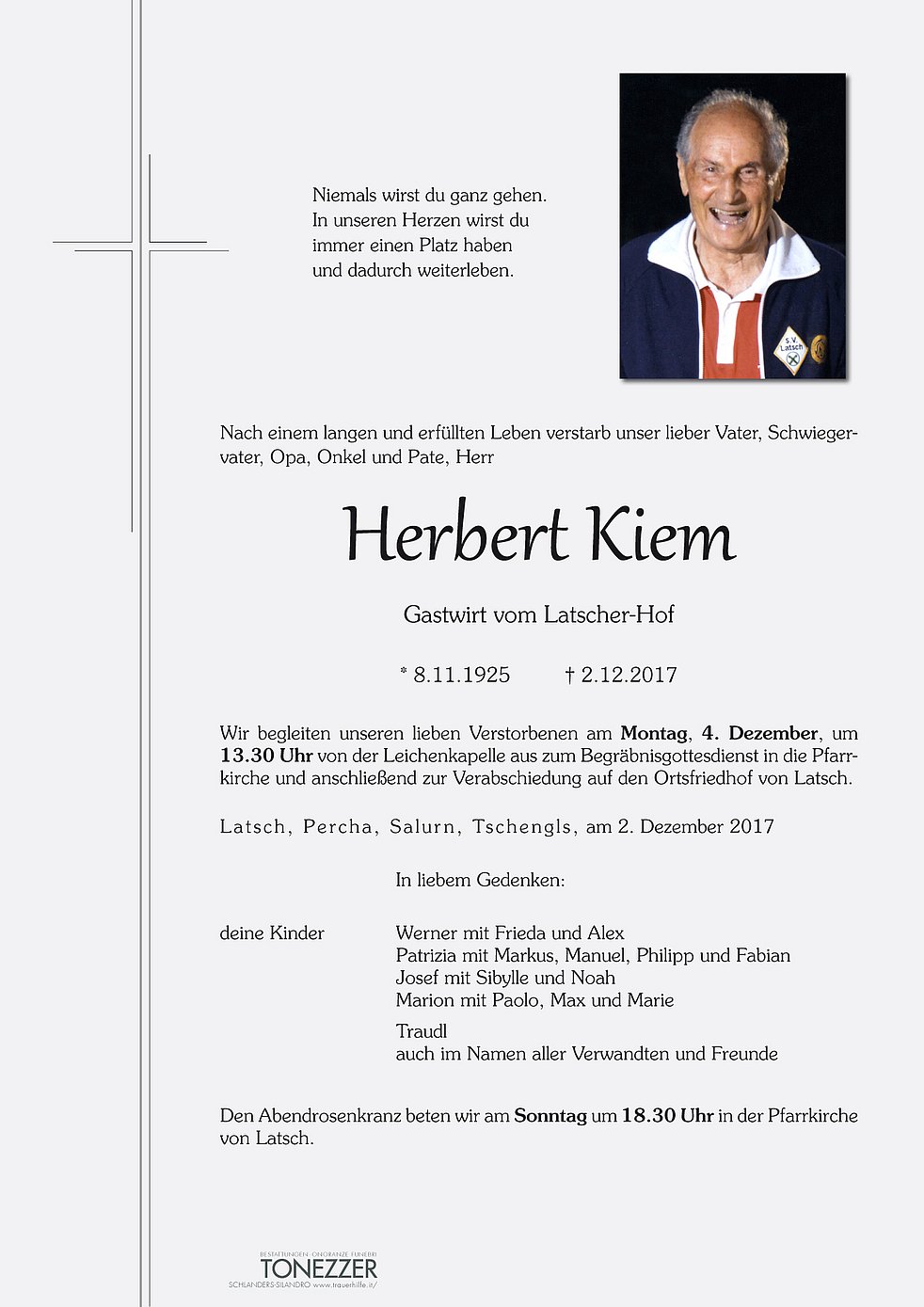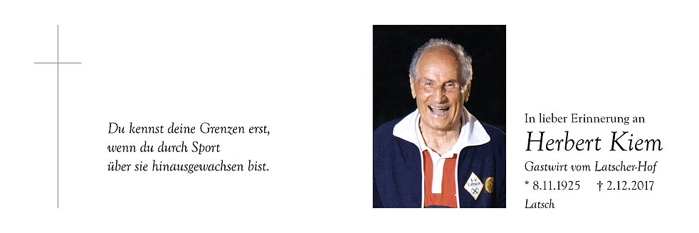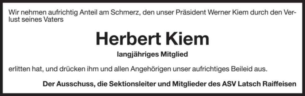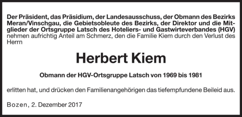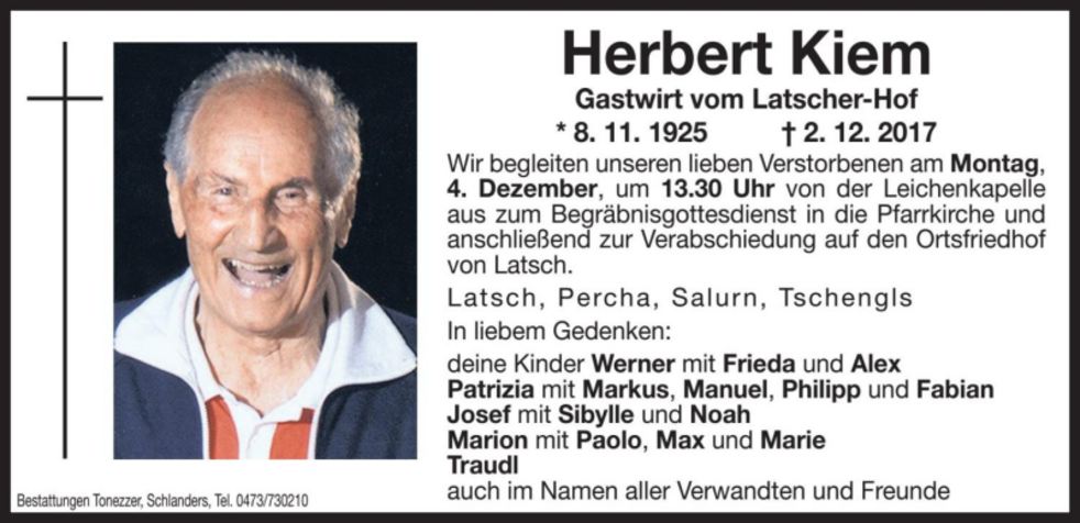 Wir begleiten unseren lieben Verstorbenen am Montag, 4. Dezember, um 13.30 Uhr von der Leichenkapelle aus zum Begräbnisgottesdienst in die Pfarrkirche und anschließend zur Verabschiedung auf den Ortsfriedhof von Latsch.