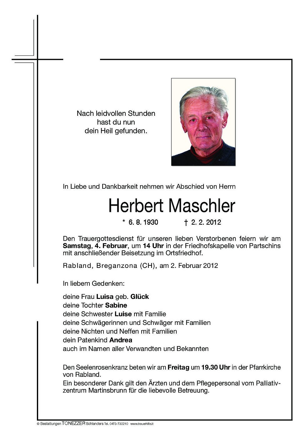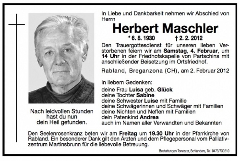 Den Trauergottesdienst für unseren lieben Verstorbenen feiern wir am Samstag, 4. Februar, um 14 Uhr in der Friedhofskapelle von Partschins mit anschließender Beisetzung im Ortsfriedhof.