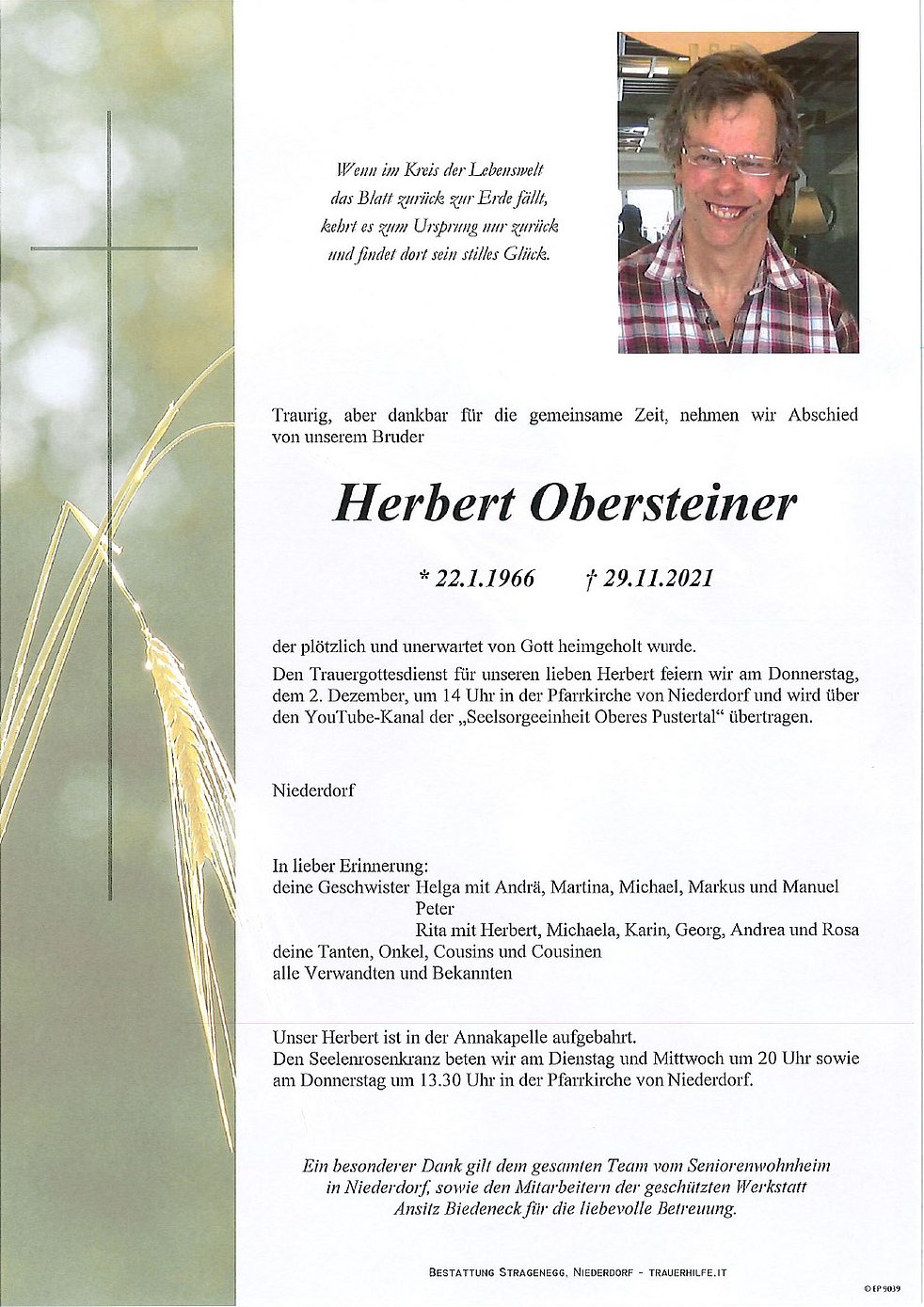 Den Trauergottesdienst für unseren lieben Herbert feiern wir am Donnerstag, dem 2. Dezember, um 14 Uhr in der Pfarrkirche von Niederdorf und wird über den YouTube-Kanal der „Seelsorgeeinheit Oberes Pustertal“ übertragen.