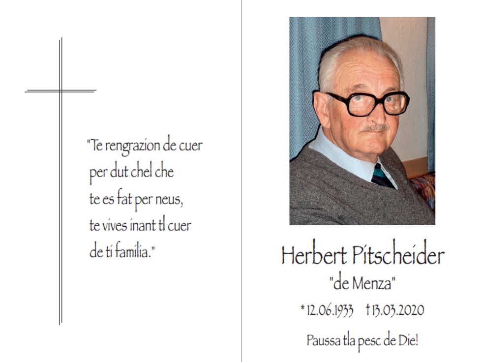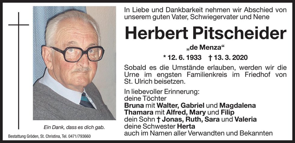 Sobald es die Umstände erlauben, werden wir die Urne im engsten Familienkreis im Friedhof von St. Ulrich beisetzen.