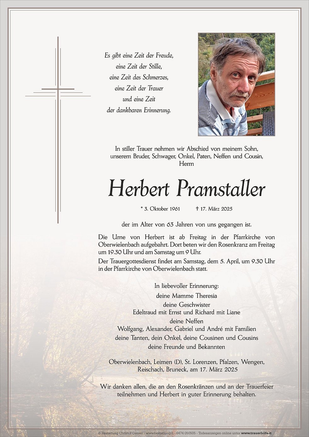 Der Trauergottesdienst findet am Samstag, dem 5. April, um 9.30 Uhr in der Pfarrkirche von Oberwielenbach statt.