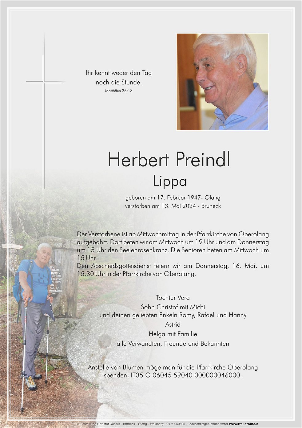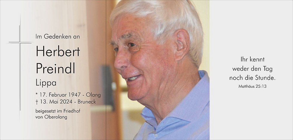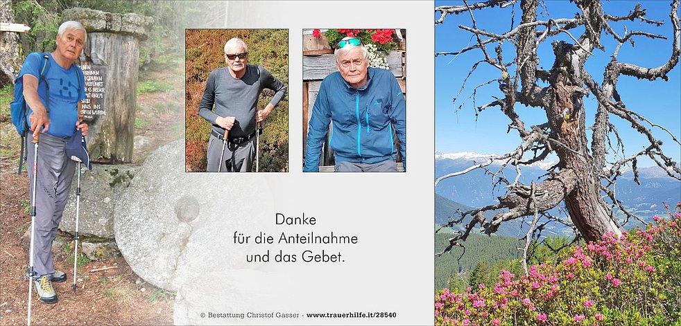 Anstelle von Blumen möge man für die Pfarrkirche Oberolang spenden, IT35 G 06045 59040 000000046000.