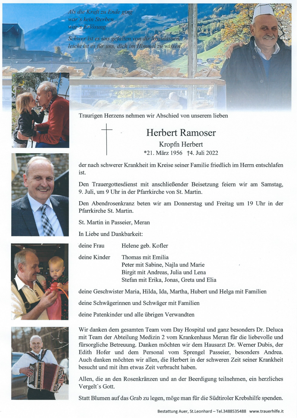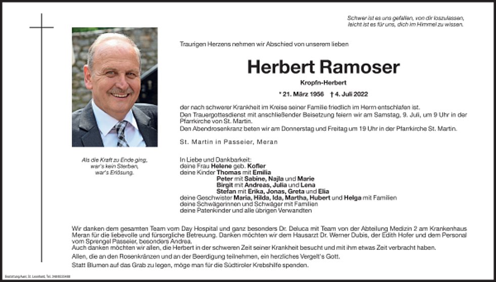 Wir danken dem gesamten Team vom Day Hospital und ganz besonders Dr. Deluca mit Team der Abteilung Medizin 2 vom Krankenhaus Meran für die liebevolle und fürsorgliche Betreuung. Danken möchten wir dem Hausarzt Dr. Werner Dubis, der Edith Hofer und dem Personal vom Sprengel Passeier, besonders Andrea. Auch danken möchten wir allen, die Herbert in der schweren Zeit seiner Krankheit besucht und mit ihm etwas Zeit verbracht haben.