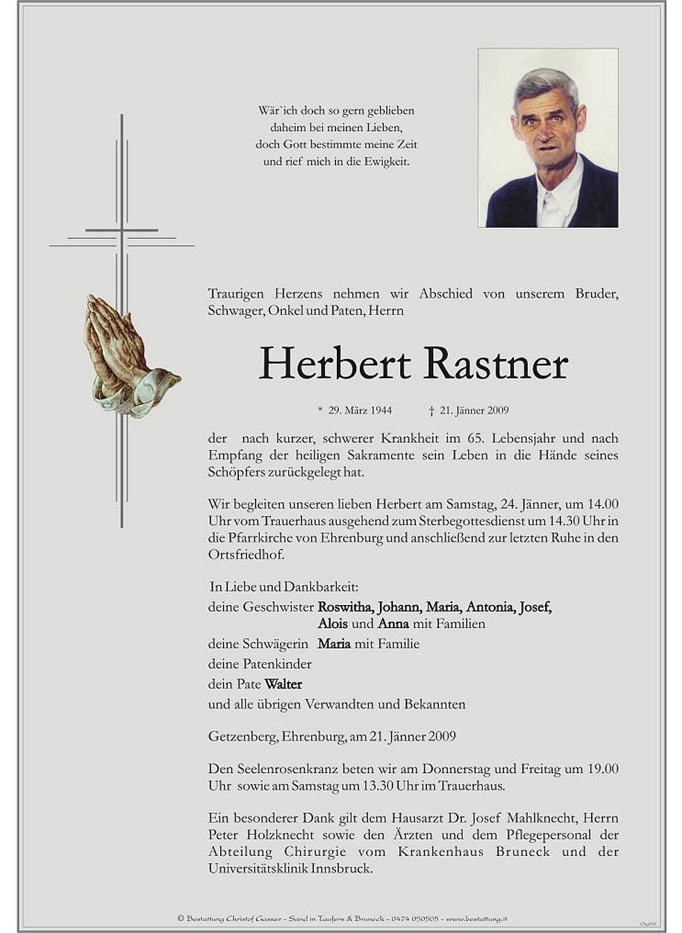 Wir begleiten unseren lieben Herbert am Samstag, 24. Jänner, um 14.00 Uhr vom Trauerhaus ausgehend zum Sterbegottesdienst um 14.30 Uhr in die Pfarrkirche von Ehrenburg und anschließend zur letzten Ruhe in den Ortsfriedhof.