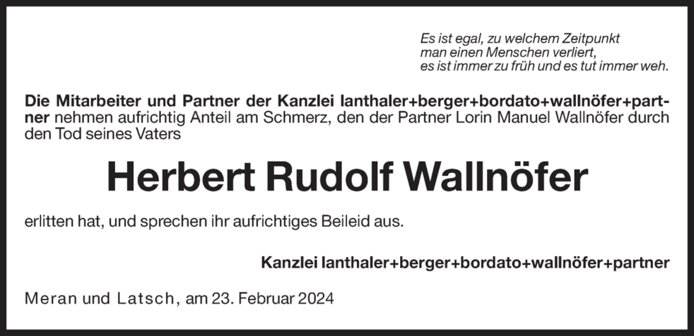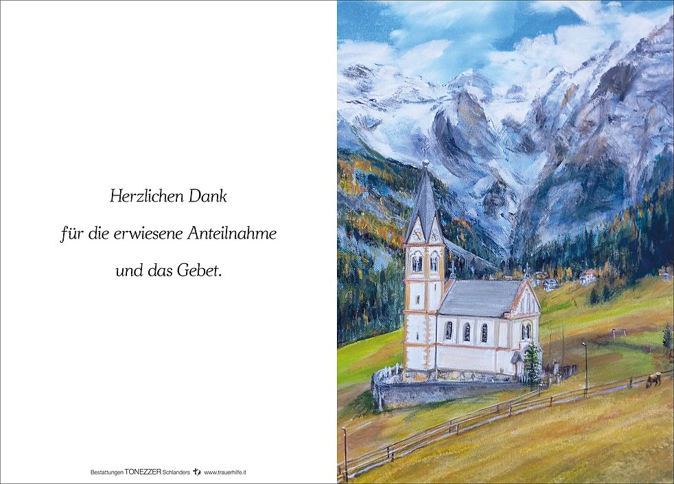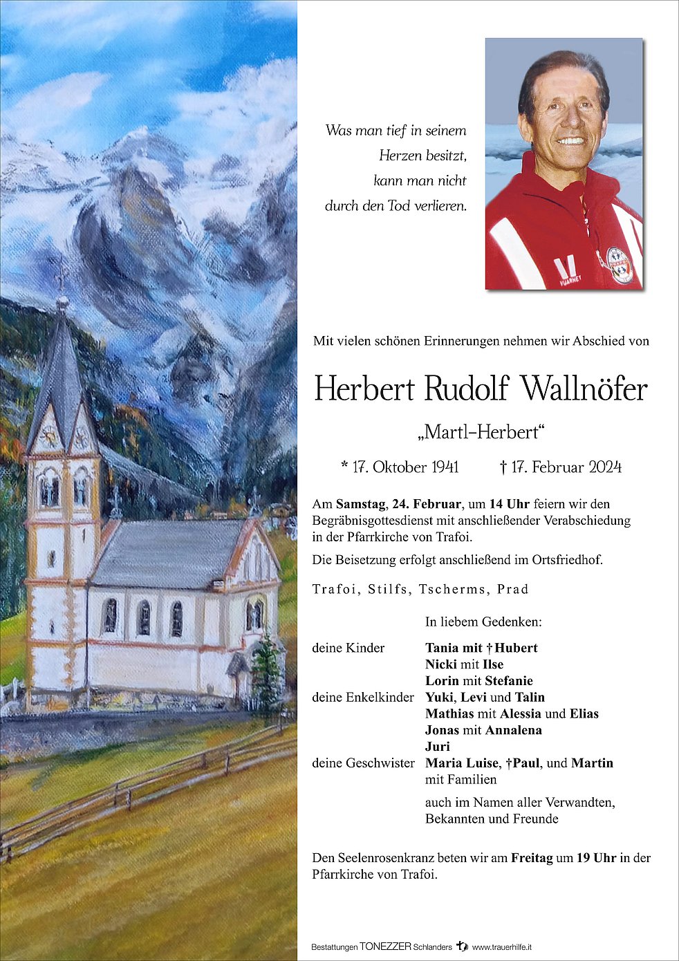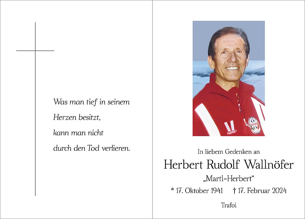 Am Samstag, 24. Februar, um 14 Uhr feiern wir den Begräbnisgottesdienst mit anschließender Verabschiedung in der Pfarrkirche von Trafoi. Die Beisetzung erfolgt anschließend im Ortsfriedhof.