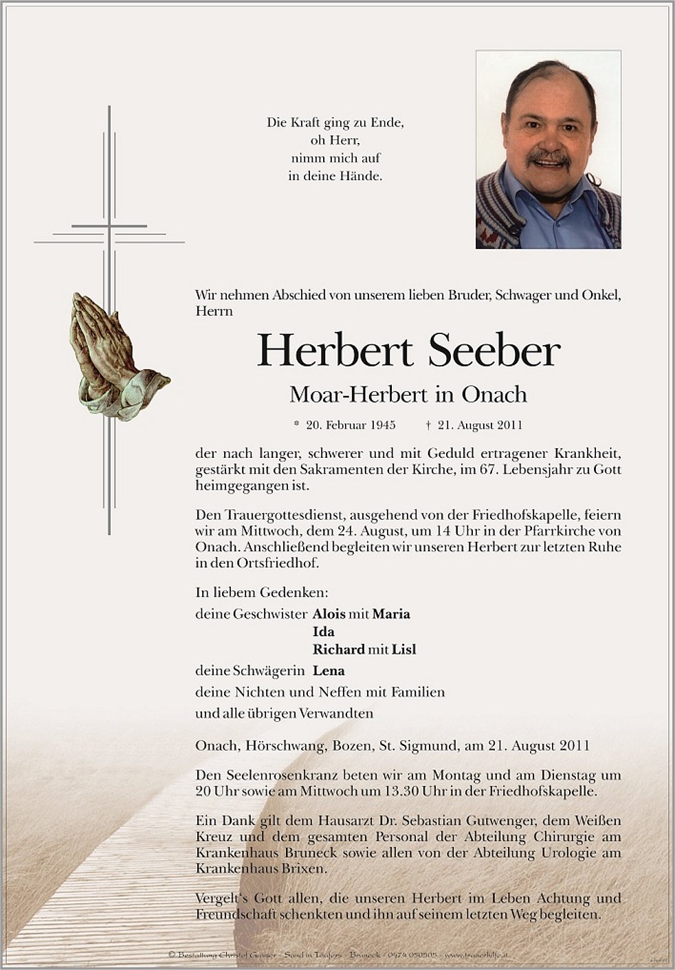 Den Trauergottesdienst, ausgehend von der Friedhofskapelle, feiern wir am Mittwoch, dem 24. August, um 14 Uhr in der Pfarrkirche von Onach. Anschließend begleiten wir unseren Herbert zur letzten Ruhe in den Ortsfriedhof.