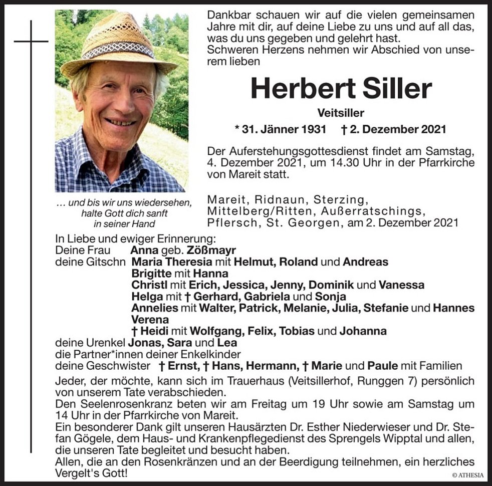 Jeder der möchte, kann sich im Trauerhaus (Veitsillerhof, Runggen 7) persönlich von unserem Tate verabschieden.