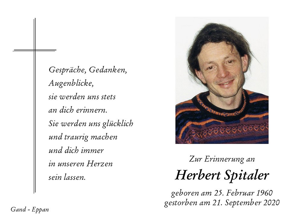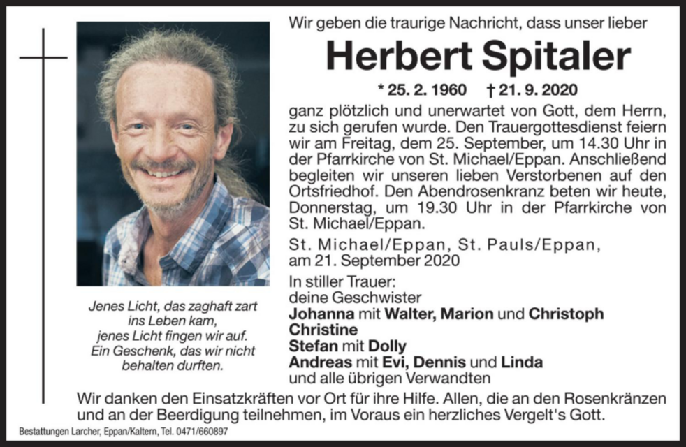 Den Trauergottesdienst feiern wir am Freitag, dem 25. September um 14.30 Uhr in der Pfarrkirche von St. Michael/Eppan. Anschließend begleiten wir unseren lieben Verstorbenen auf den Ortsfriedhof.
