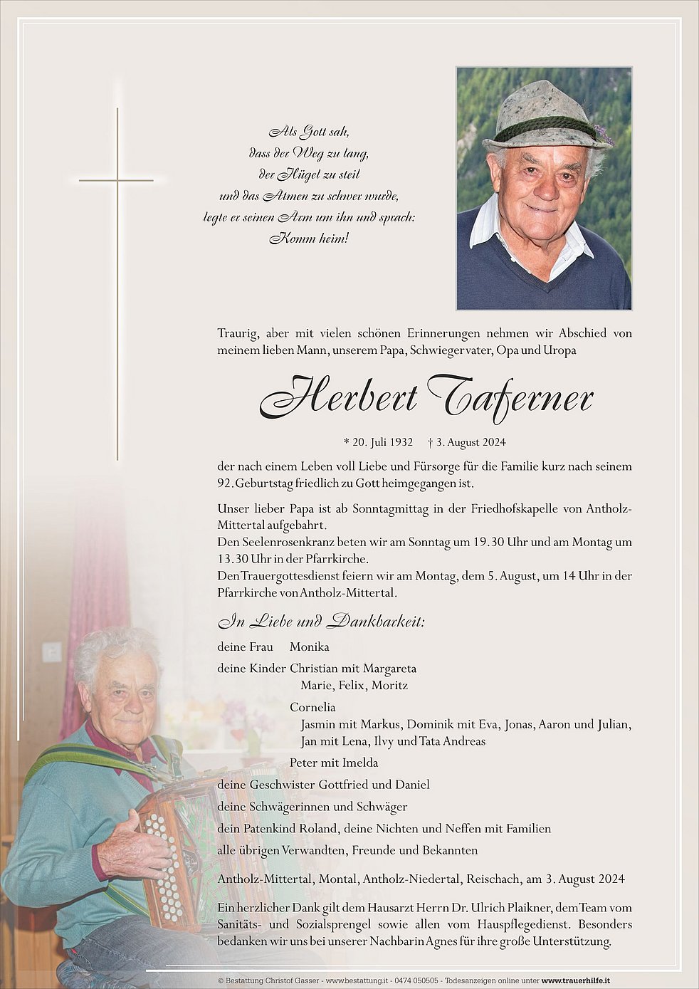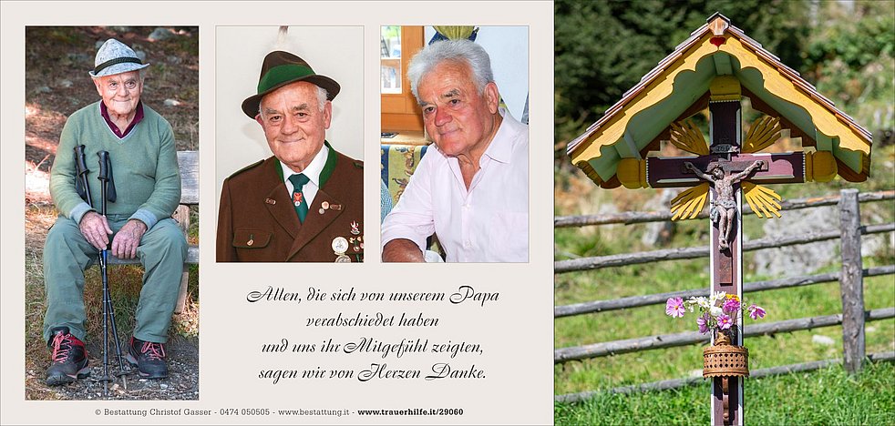 Ein herzlicher Dank gilt dem Hausarzt Herrn Dr. Ulrich Plaikner, dem Team vom Sanitäts- und Sozialsprengel sowie allen vom Hauspflegedienst. Besonders bedanken wir uns bei unserer Nachbarin Agnes für ihre große Unterstützung.