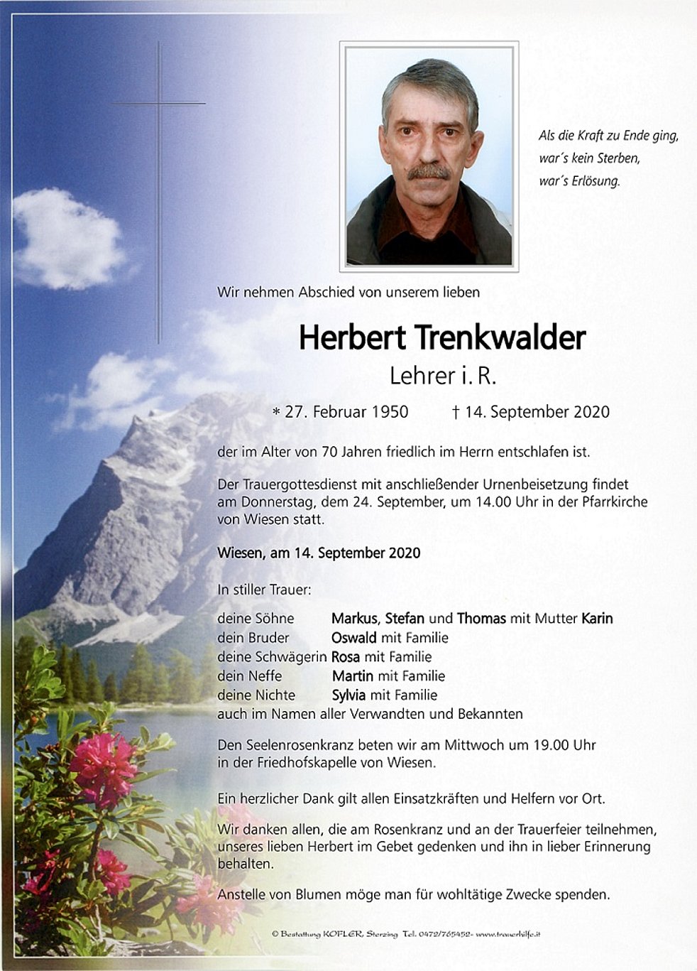 Wir danken allen, die am Rosenkranz und an der Trauerfeier teilnehmen, unseres lieben Herbert im Gebet gedenken und ihn in lieber Erinnerung behalten.