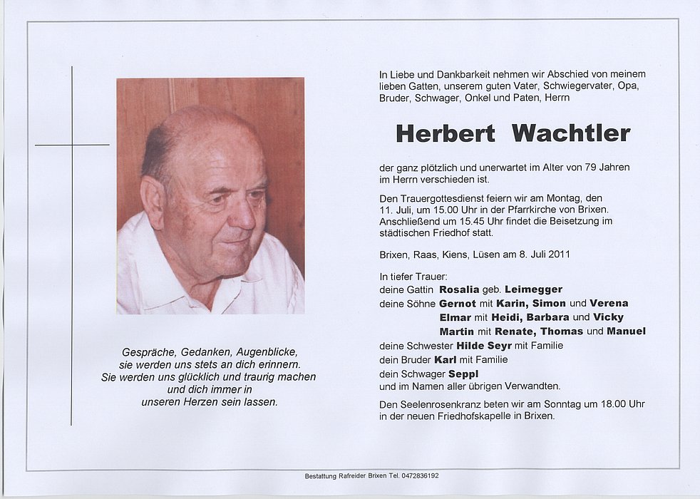 Den Trauergottesdienst feiern wir am Montag, den 11. Juli, um 15.00 Uhr in der Pfarrkirche von Brixen. Anschließend um 15.45 Uhr findet die Beisetzung im