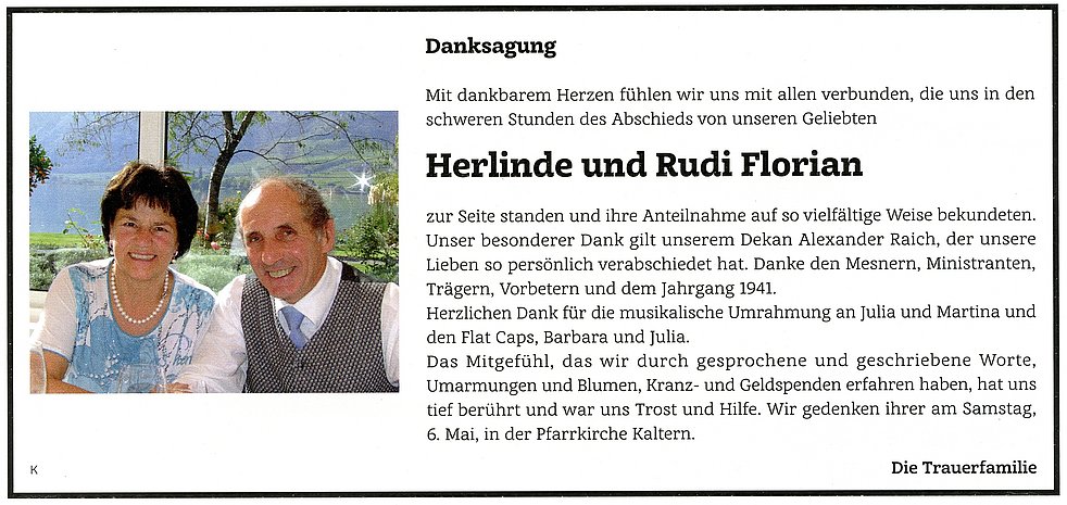Allen, die am Rosenkranz und an der Beerdigung teilnehmen im Voraus ein herzliches Vergelt`s Gott.
