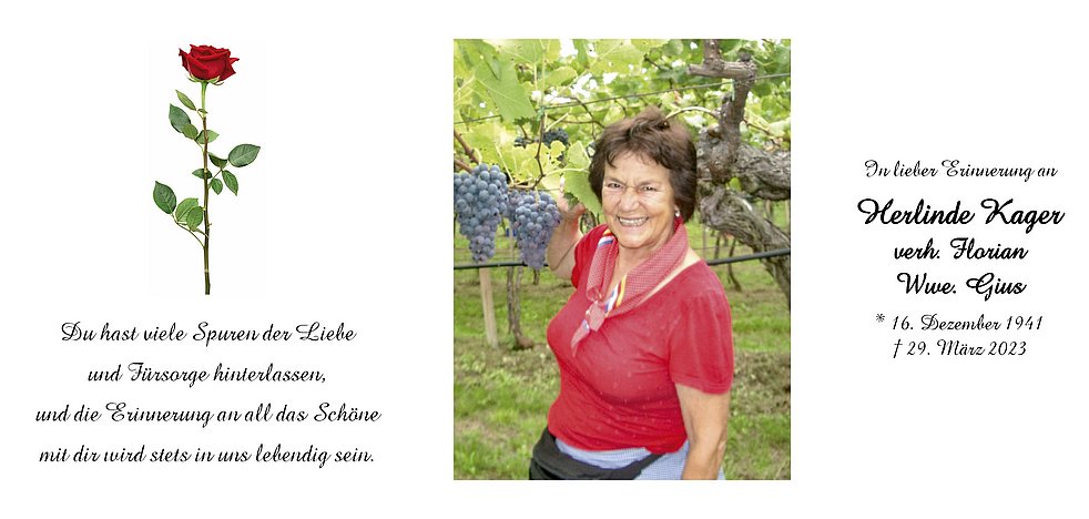 Wir sagen dir Vergelt’s Gott für alles, was du für uns getan hat, und danken dir für die schönen Jahre, die wir mit dir verbringen durften. Du hast uns allen deine Liebe und deinen Sonnenschein geschenkt. Wir bitten dich, uns von dort aus zu begleiten. Gott der Herr hat meine liebe Mama, Frau, unsere Oma, Schwägerin, Tante und Patin