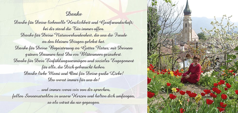 Wir danken allen, die unsere Mama in dieser letzten, schweren Zeit betreut und begleitet haben. Ein besonderer Dank gilt Frau Dr. Katrin Gapp und Irene sowie unserem herzlichen Pflegeteam Karmen und Johanna für die liebevolle Betreuung.