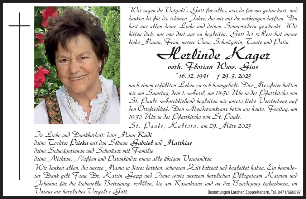 Die Messfeier halten wir am Samstag, dem 1. April um 14.30 Uhr in der Pfarrkirche von St. Pauls. Anschließend begleiten wir unsere liebe Verstorbene auf den Ortsfriedhof.