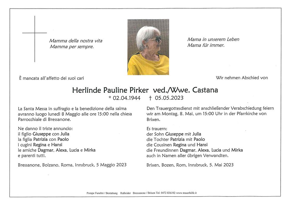 Trauerfeier: 08.05. - 15:00 Uhr Pfarrkirche Brixen