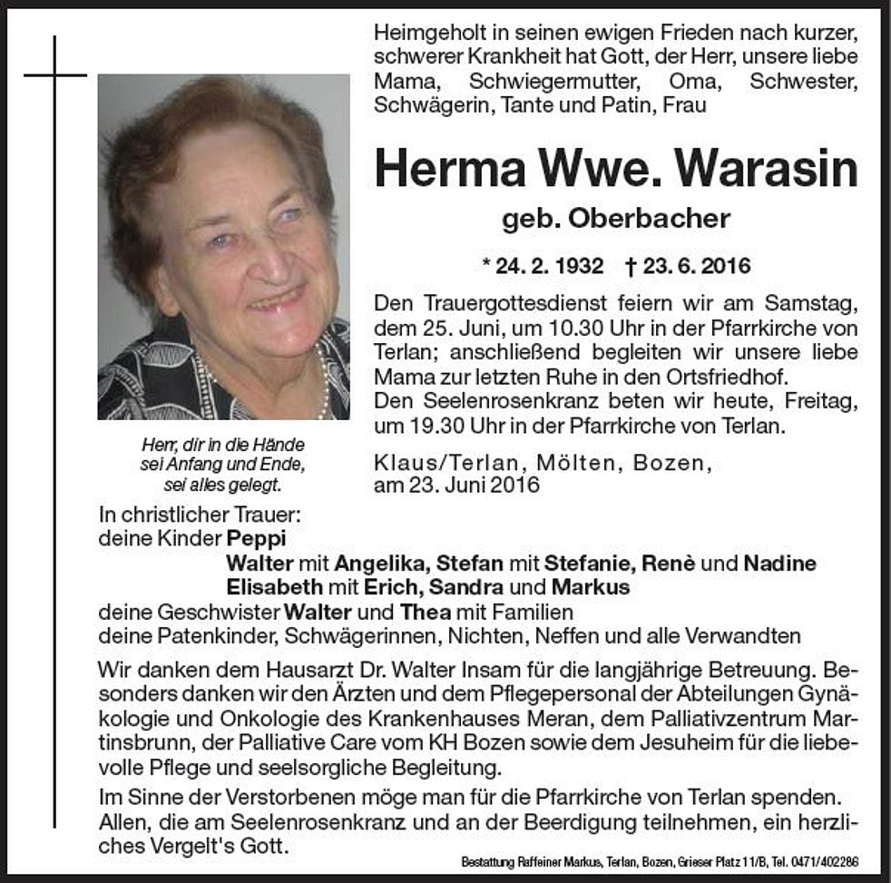 Den Trauergottesdienst feiern wir am Samstag, den 25. Juni, um 10.30 Uhr in der Pfarrkirche von Terlan; anschließend begleiten wir unsere liebe Mama zur letzten Ruhe in den Ortsfriedhof.