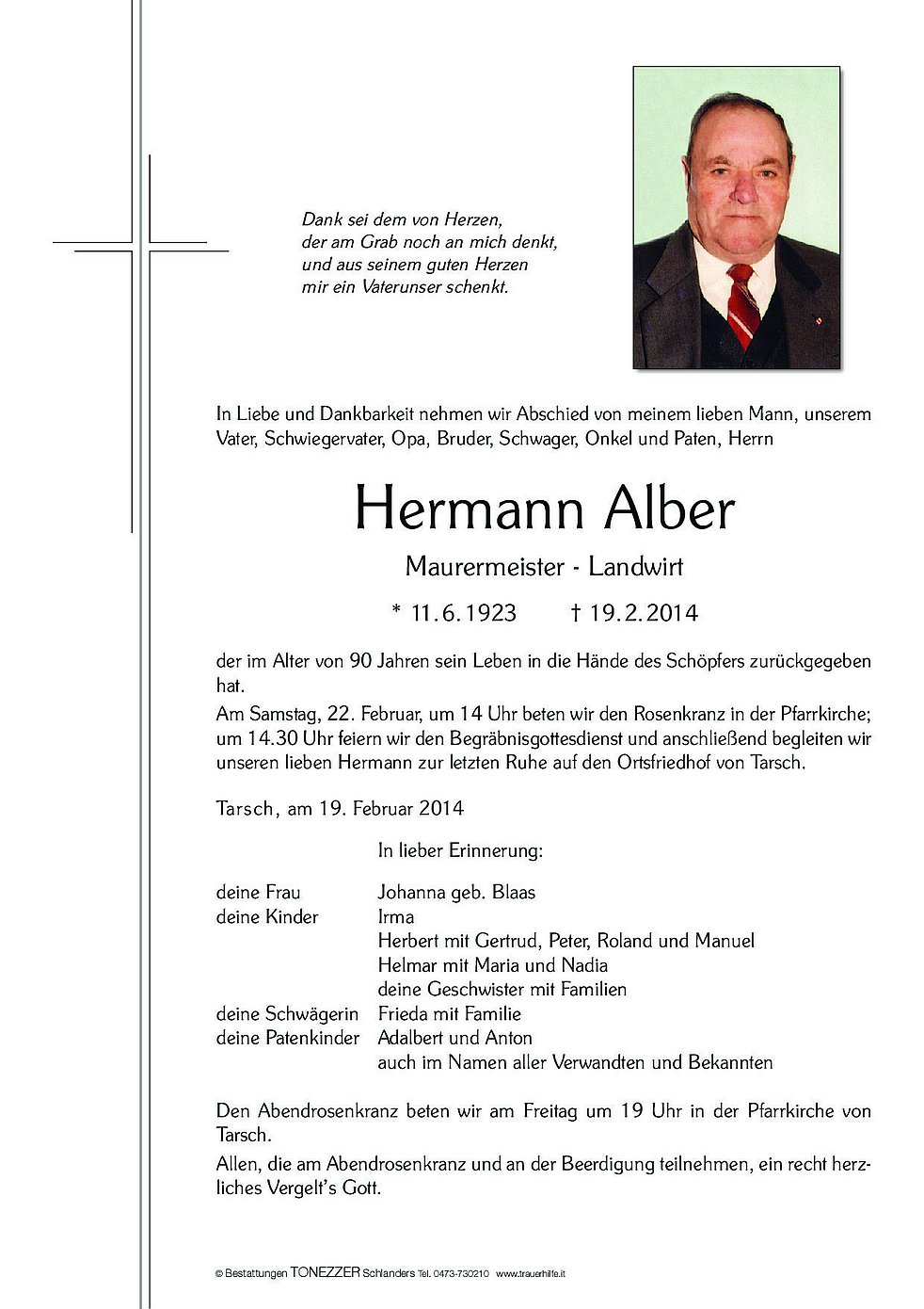 Am Samstag, 22. Februar, um 14 Uhr beten wir den Rosenkranz in der Pfarrkirche; um 14.30 Uhr feiern wir den Begräbnisgottesdienst und anschließend begleiten wir unseren lieben Hermann zur letzten Ruhe auf den Ortsfriedhof von Tarsch.