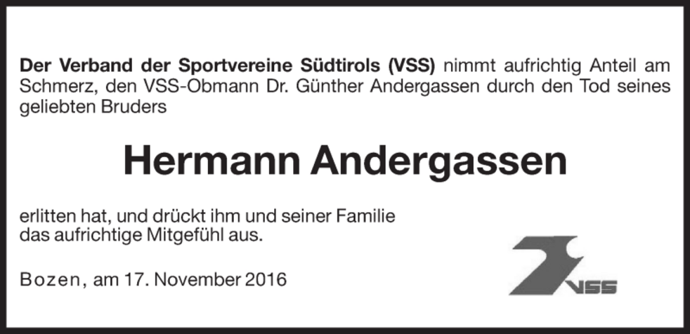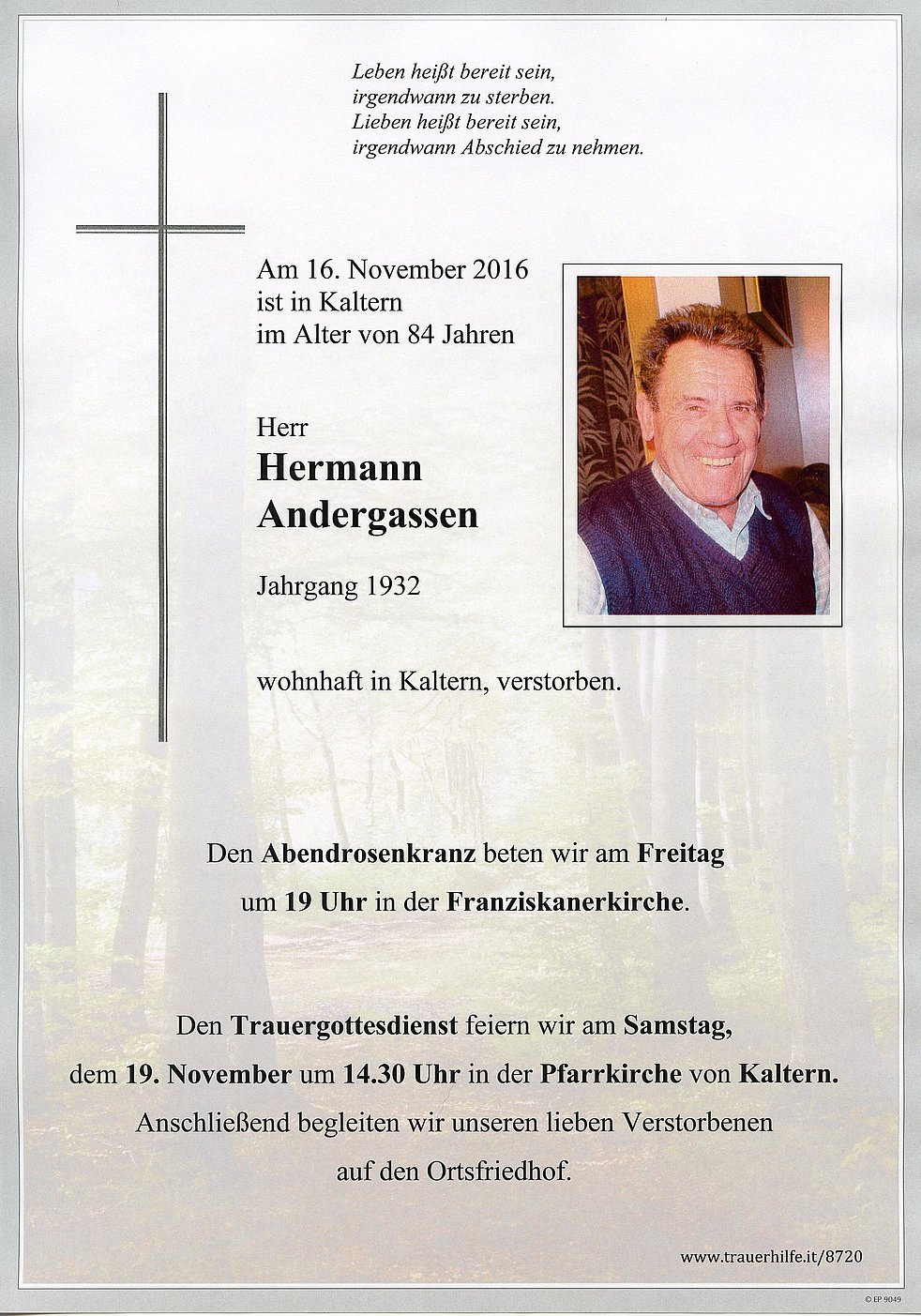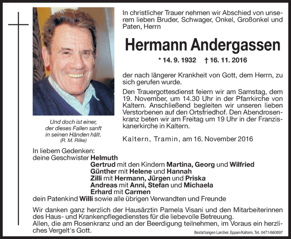Den Trauergottesdienst feiern wir am Samstag, dem 19. November um 14.30 Uhr in der Pfarrkirche von Kaltern. Anschließend begleiten wir unseren lieben Verstorbenen auf den Ortsfriedhof.