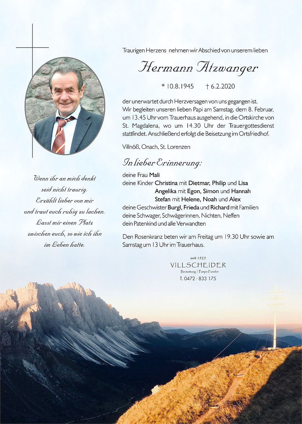 Aufrichtige Anteilnahme dir Male, Tina, Angelika und Stefan, Lisa, Philip , Es ist so schwer, passende und tröstende Worte zu finden. Die Welt ist um einen lieben Menschen ärmer geworden. Pfiati Hermann