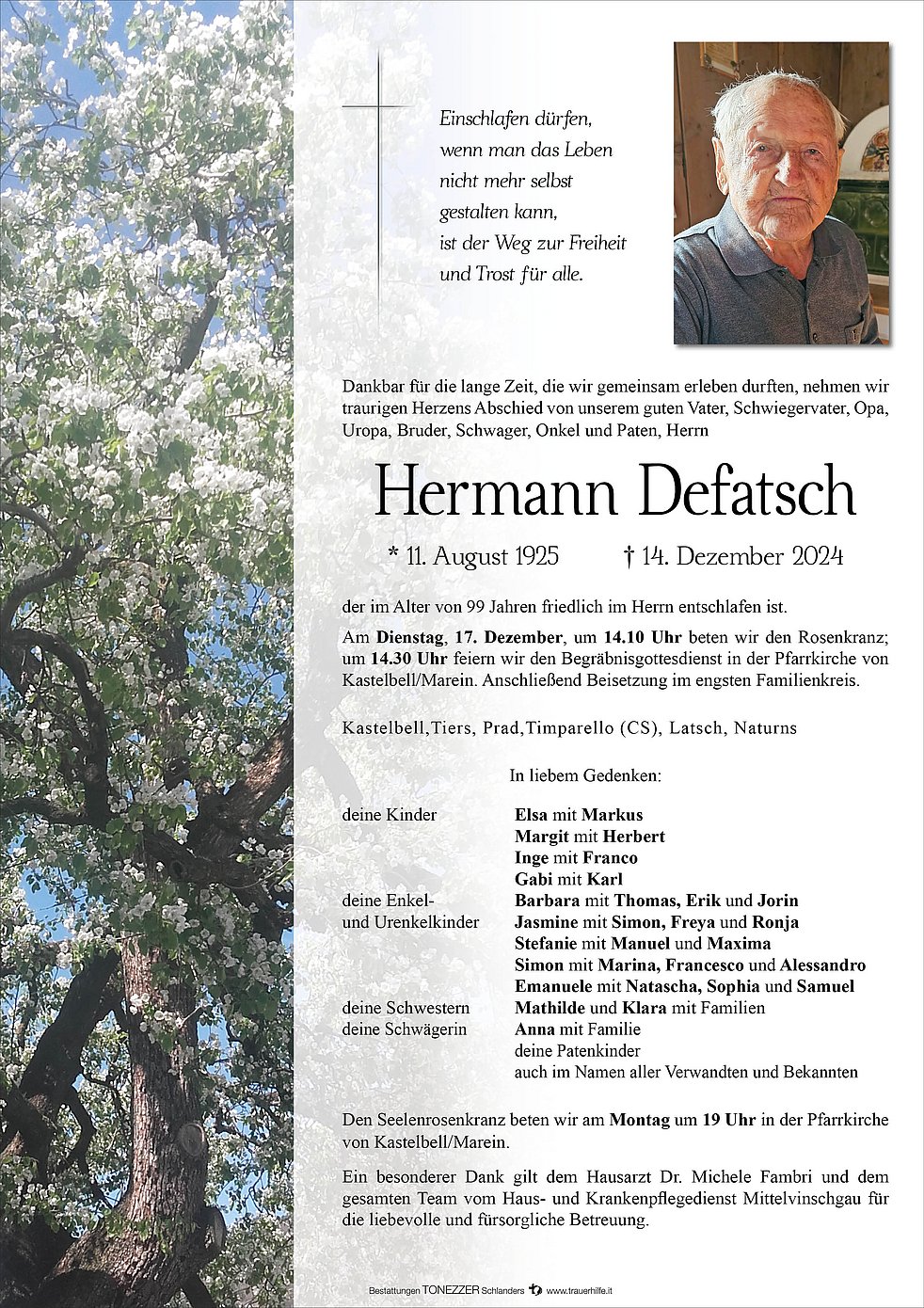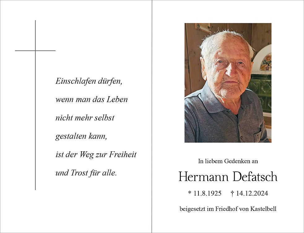 Am Dienstag, 17. Dezember, um 14.10 Uhr beten wir den Rosenkranz; um 14.30 Uhr feiern wir den Begräbnisgottesdienst in der Pfarrkirche von Kastelbell/Marein. Anschließend Beisetzung im engsten Familienkreis.