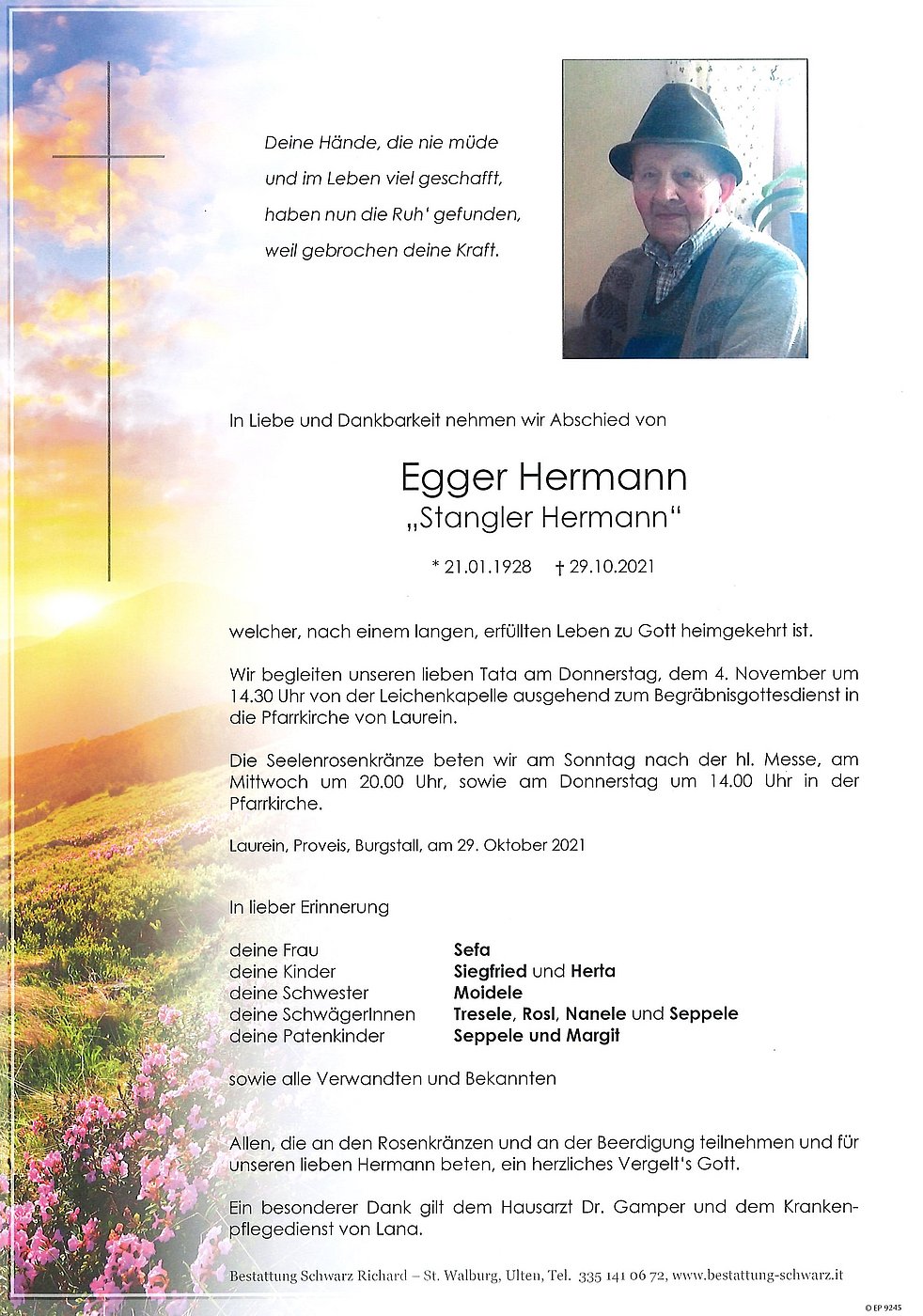 Wir begleiten unseren lieben Tata am Donnerstag, dem 4. November um 14.30 Uhr von der Leichenkapelle ausgehend zum Begräbnisgottesdienst in die Pfarrkirche von Laurein.