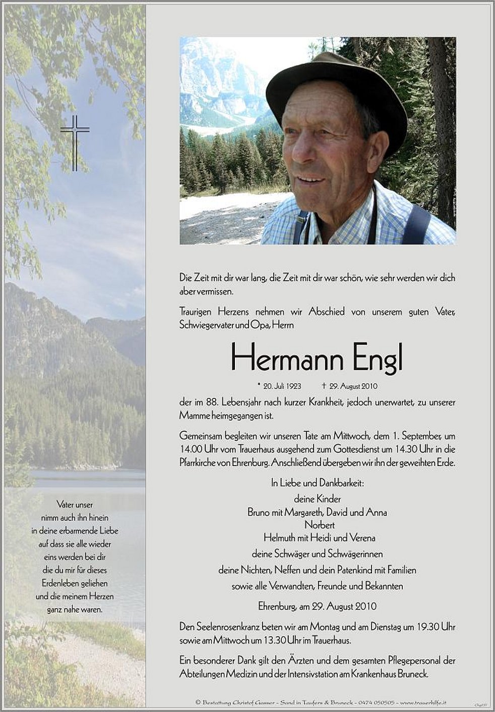 Gemeinsam begleiten wir unseren Tate am Mittwoch, dem 1. September, um 14.00 Uhr vom Trauerhaus ausgehend zum Gottesdienst um 14.30 Uhr in die Pfarrkirche von Ehrenburg. Anschließend übergeben wir ihn der geweihten Erde.