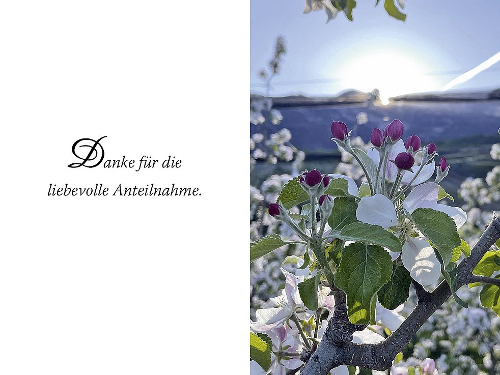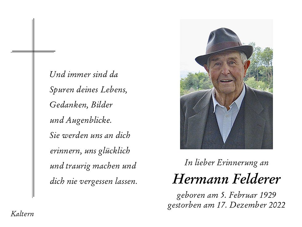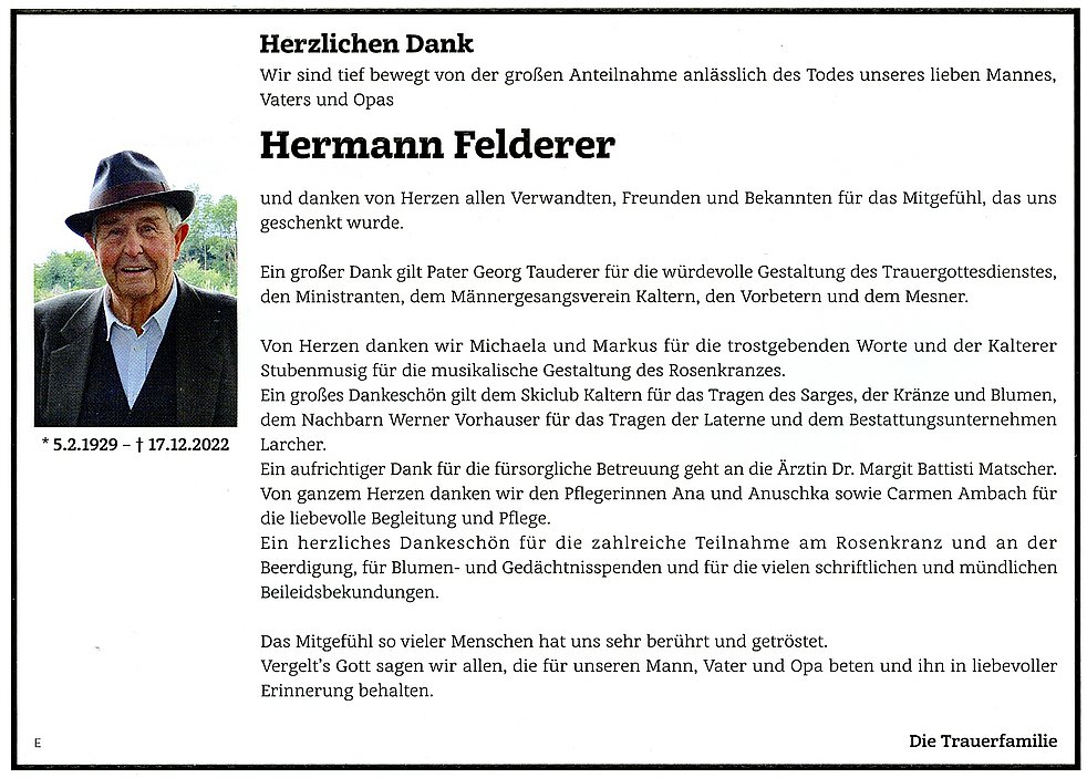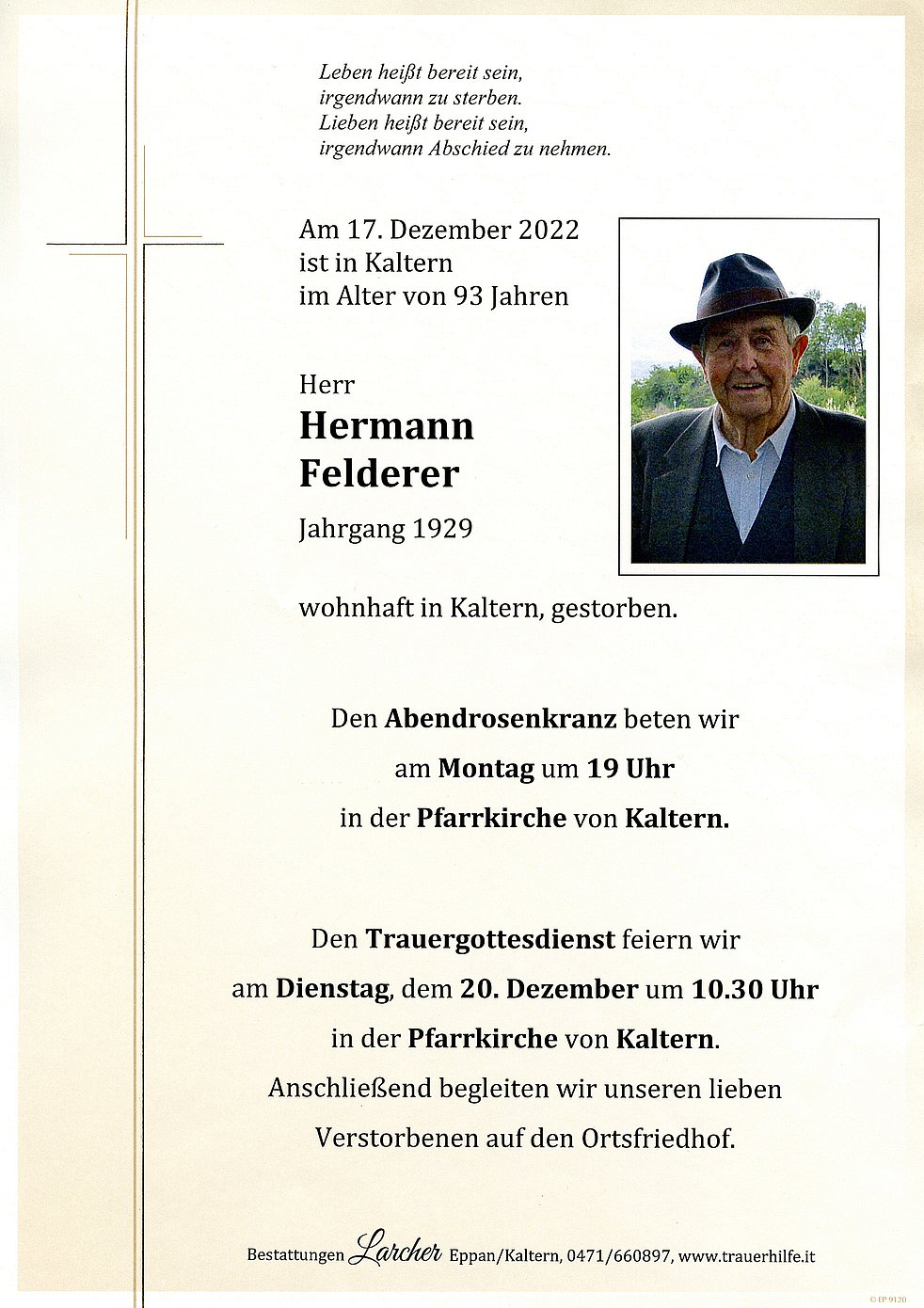 Den Trauergottesdienst feiern wir am Dienstag, dem 20. Dezember um 10.30 Uhr in der Pfarrkirche von Kaltern. Anschließend begleiten wir unseren lieben Verstorbenen auf den Ortsfriedhof.