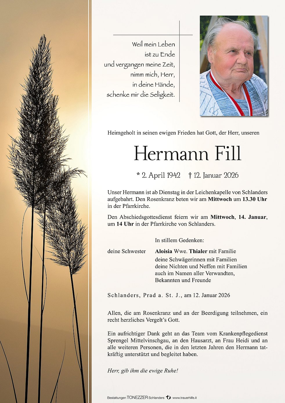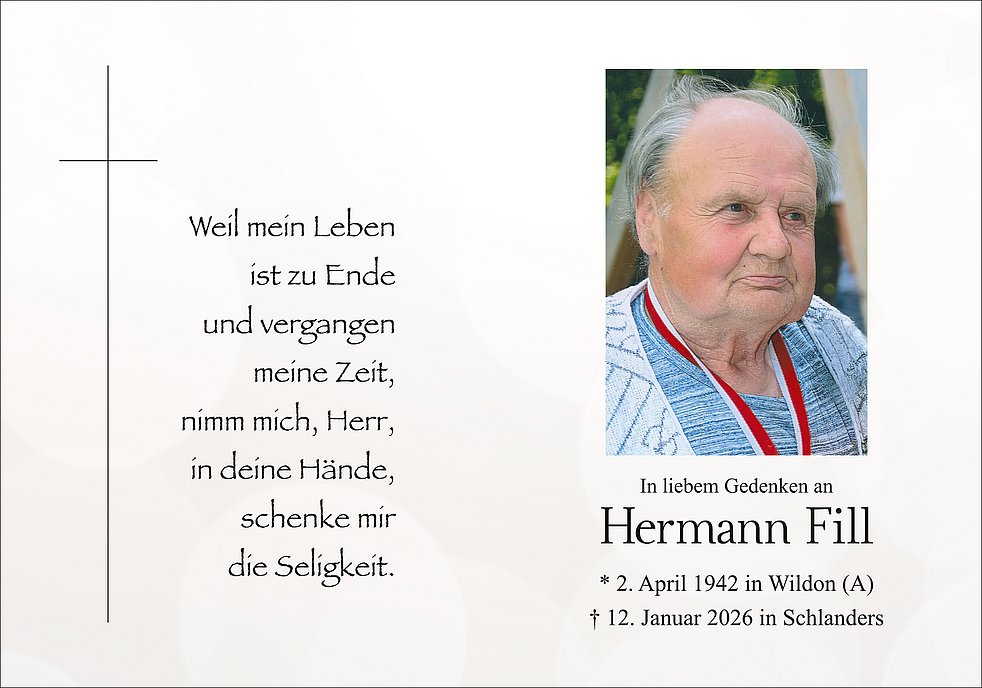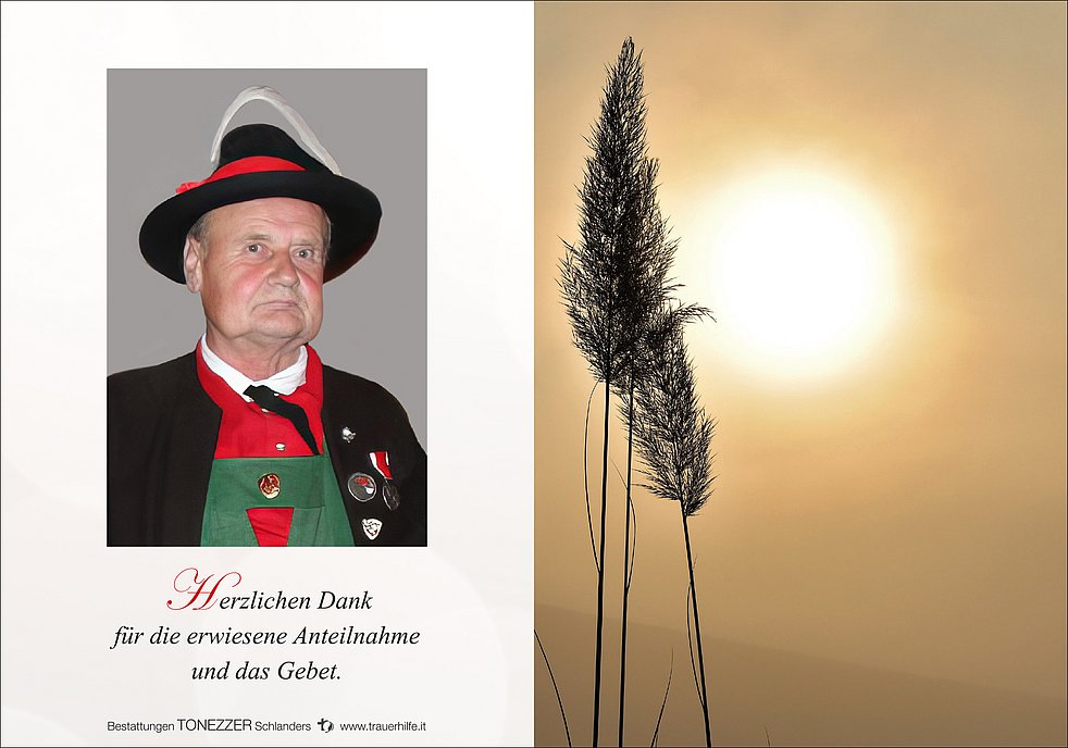 Ein aufrichtiger Dank geht an das Team vom Krankenpflegedienst Sprengel Mittelvinschgau, an den Hausarzt, an Frau Heidi und an alle weiteren Personen, die in den letzten Jahren den Hermann tatkräftig unterstützt und begleitet haben.