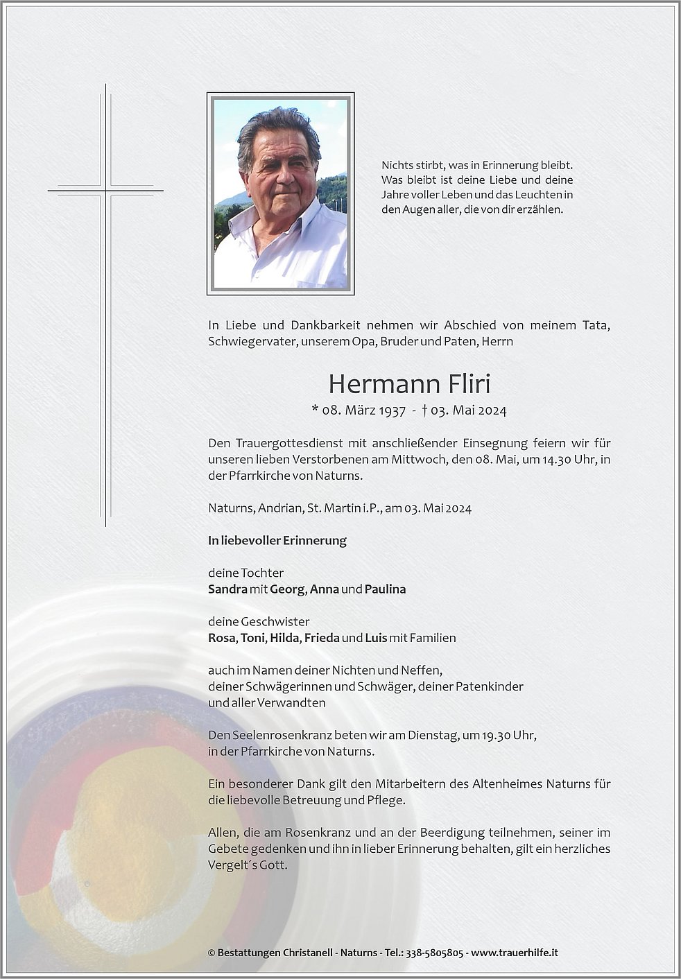 Den Trauergottesdienst mit anschließender Einsegnung feiern wir für unseren lieben Verstorbenen am Mittwoch, den 08. Mai, um 14.30 Uhr, in der Pfarrkirche von Naturns.