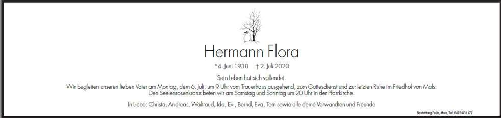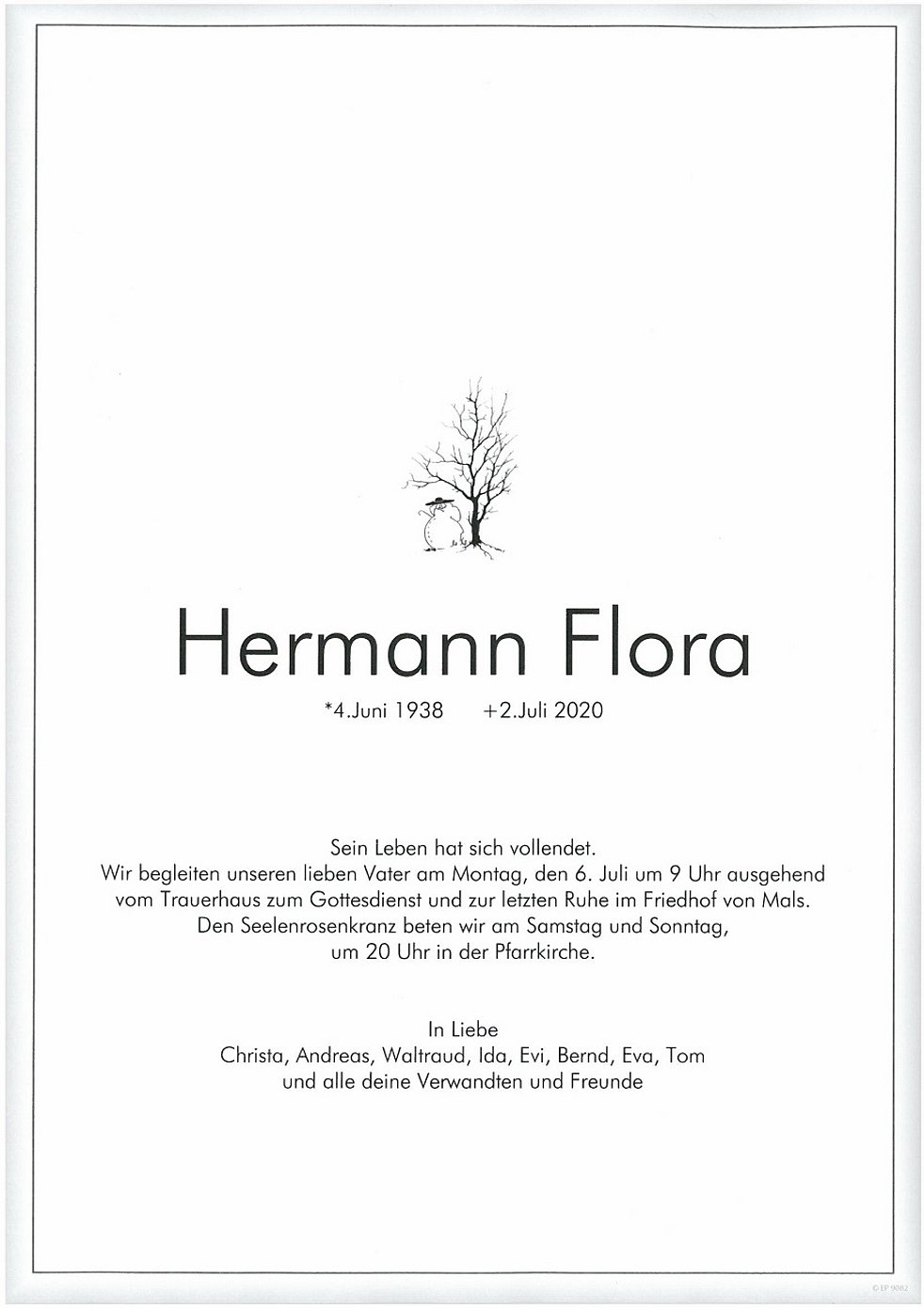 Mein aufrichtiges Beileid zu Eurem Verlust! "Der Flora Hermann" wird mir im Gedenken bleiben als ein aufrichtiger Tiroler, grosser Künstler und wunderbarer und interessanter Erzähler. Manchmal mit viel Witz, aber auch mit gehöriger "Bissigkeit", wenn sie angebracht war! Ruhe nun in Frieden!