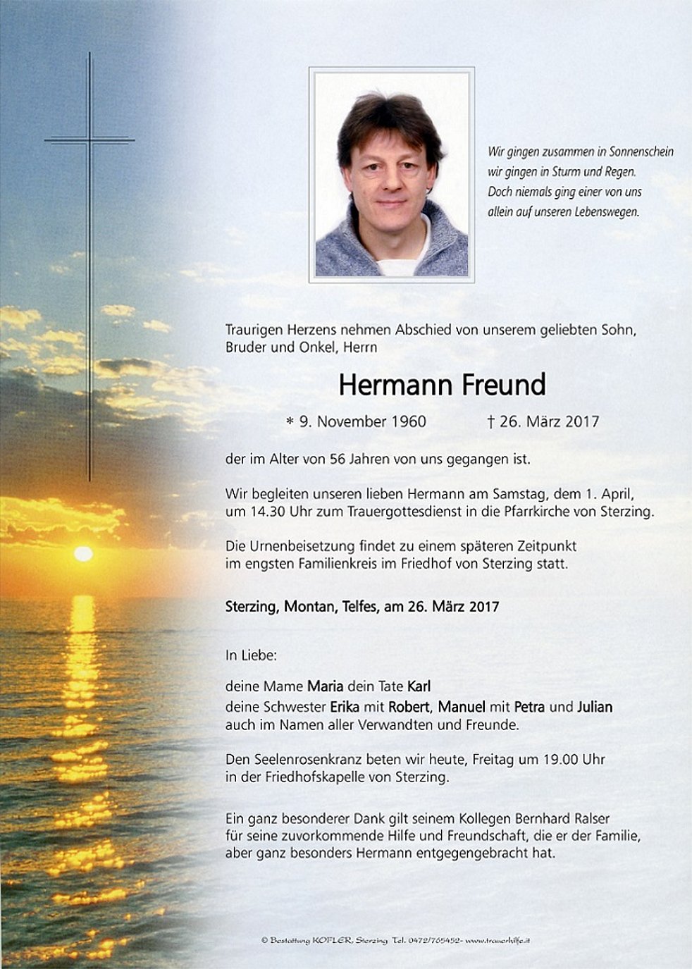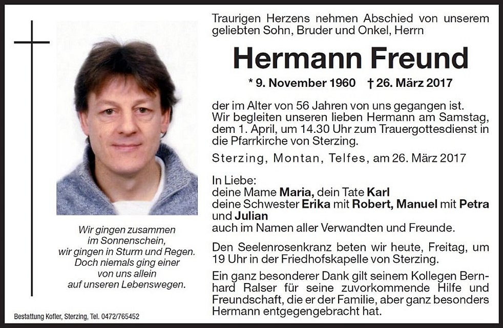 Wir begleiten unseren lieben Hermann am Samstag, dem 1. April, um 14.30 Uhr zum Trauergottesdienst in die Pfarrkirche von Sterzing.
