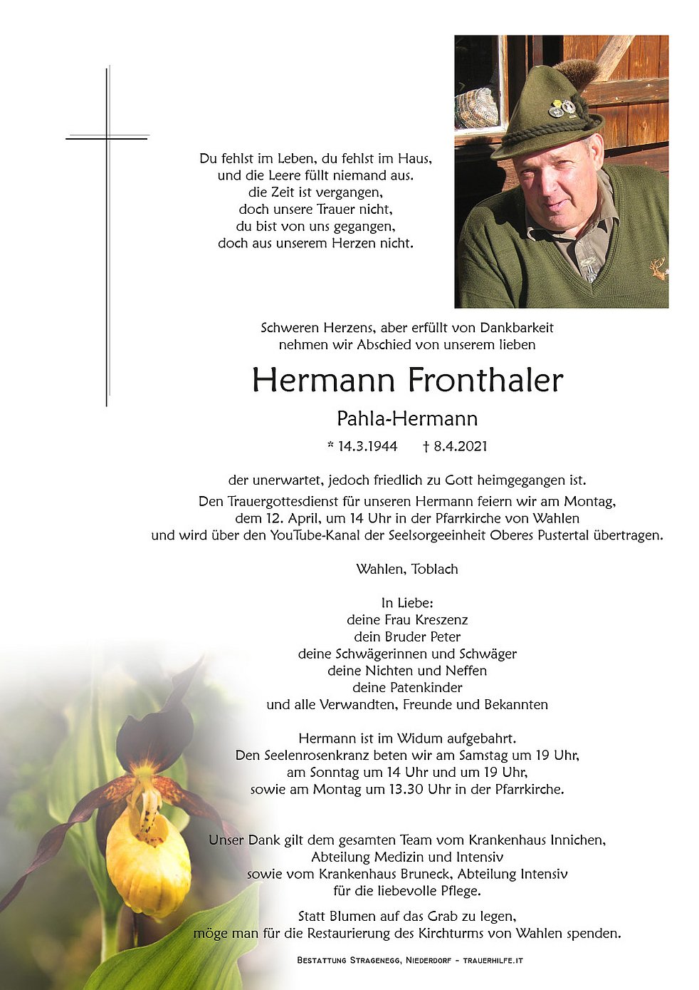 Den Trauergottesdienst für unseren Hermann feiern wir am Montag, dem 12. April, um 14 Uhr in der Pfarrkirche von Wahlen und wird über den YouTube-Kanal der Seelsorgeeinheit Oberes Pustertal übertragen.