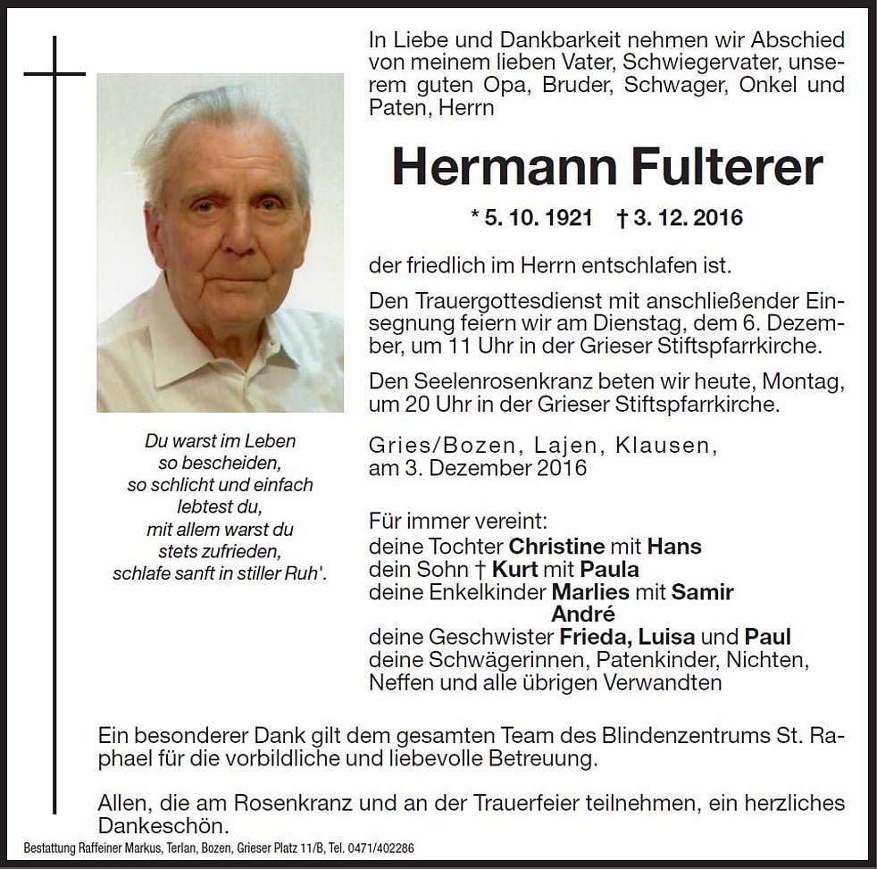 Den Trauergottesdienst mit anschlieβender Einsegnung feiern wir am Dienstag, dem 6. Dezember, um 11 Uhr in der Grieser Stiftspfarrkirche.