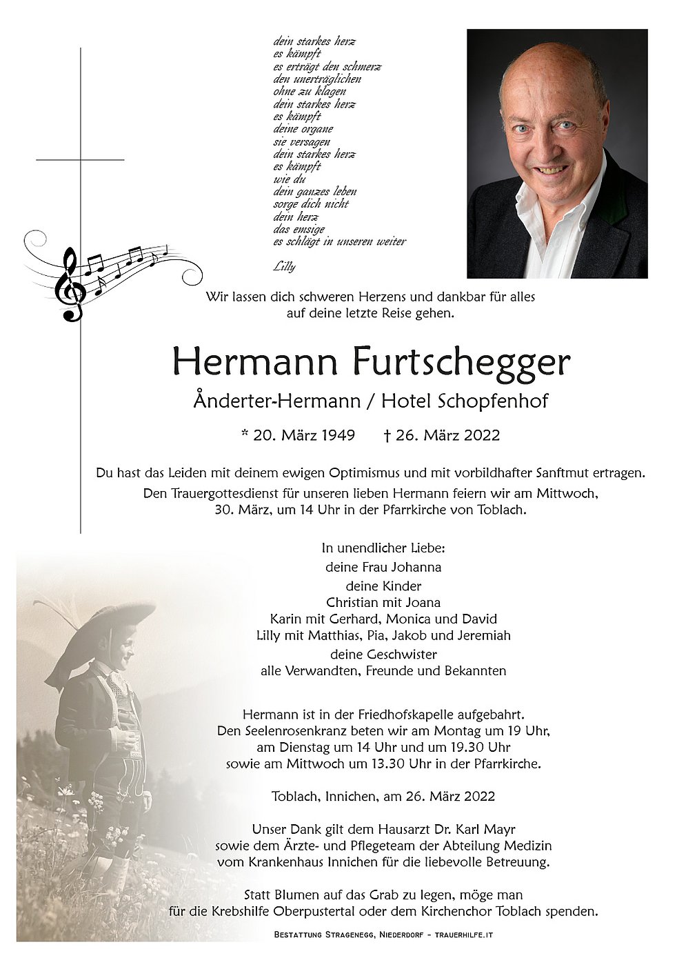 Den Trauergottesdienst für unseren lieben Hermann feiern wir am Mittwoch, 30. März, um 14 Uhr in der Pfarrkirche von Toblach.