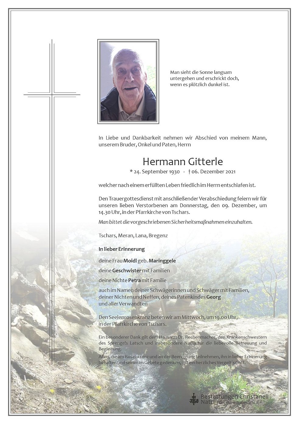 Den Trauergottesdienst mit anschließender Verabschiedung feiern wir für unseren lieben Verstorbenen am Donnerstag, den 09. Dezember, um 14.30 Uhr, in der Pfarrkirche von Tschars.