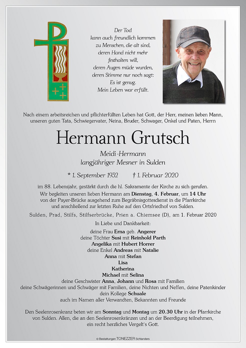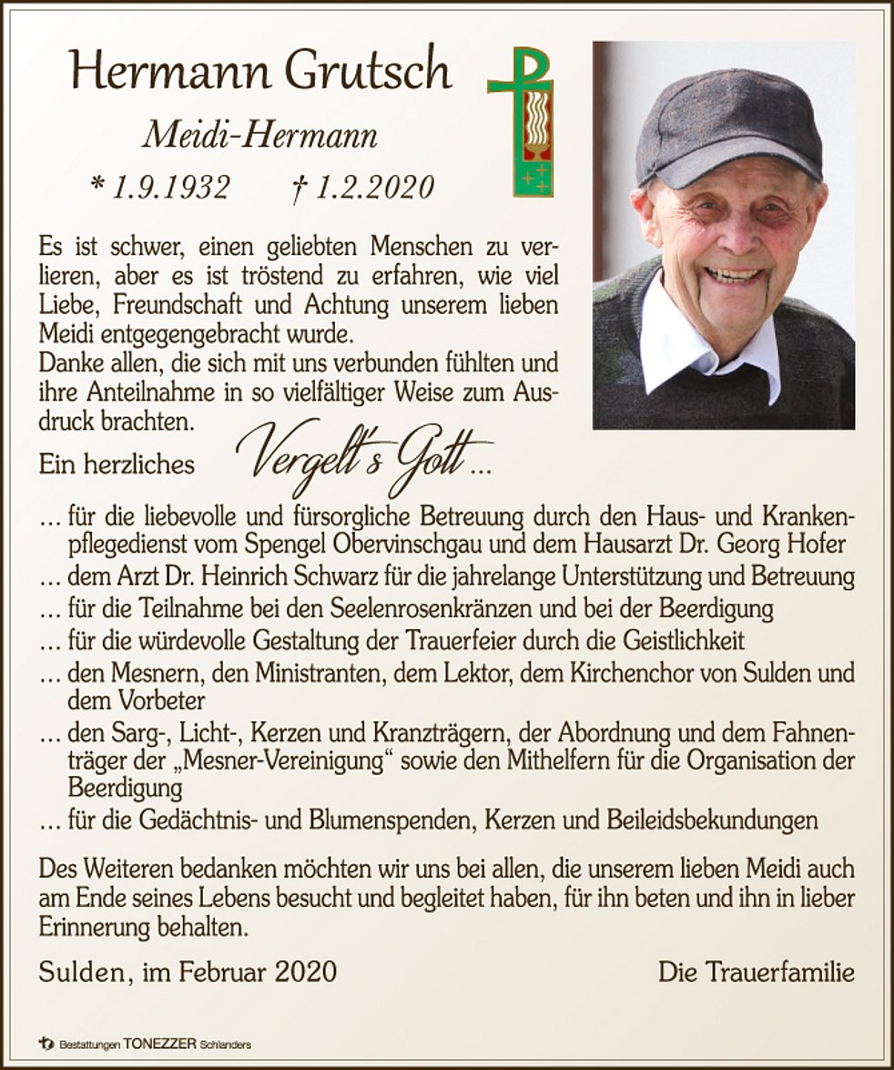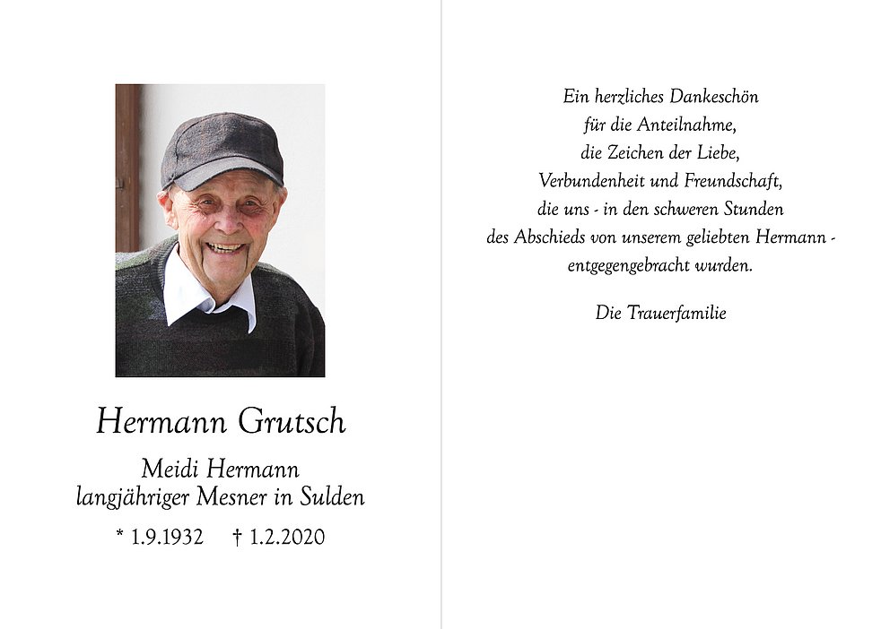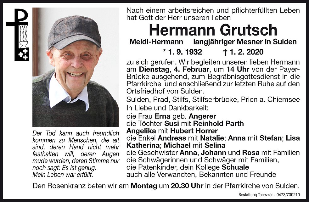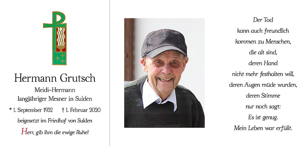 Wir begleiten unseren lieben Hermann am Dienstag, 4. Februar, um 14 Uhr von der Payer-Brücke ausgehend zum Begräbnisgottesdienst in die Pfarrkirche und anschließend zur letzten Ruhe auf den Ortsfriedhof von Sulden.