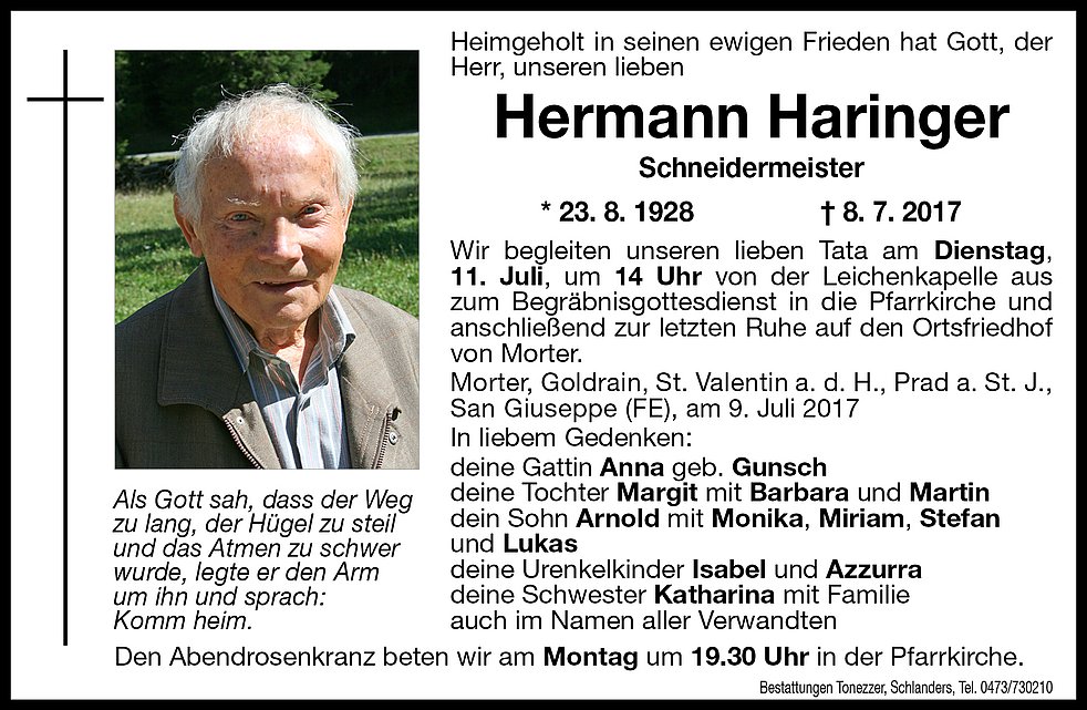 Wir begleiten unseren lieben Tata am Dienstag, 11. Juli, um 14 Uhr von der Leichenkapelle aus zum Begräbnisgottesdienst in die Pfarrkirche und anschließend zur letzten Ruhe auf den Ortsfriedhof von Morter.