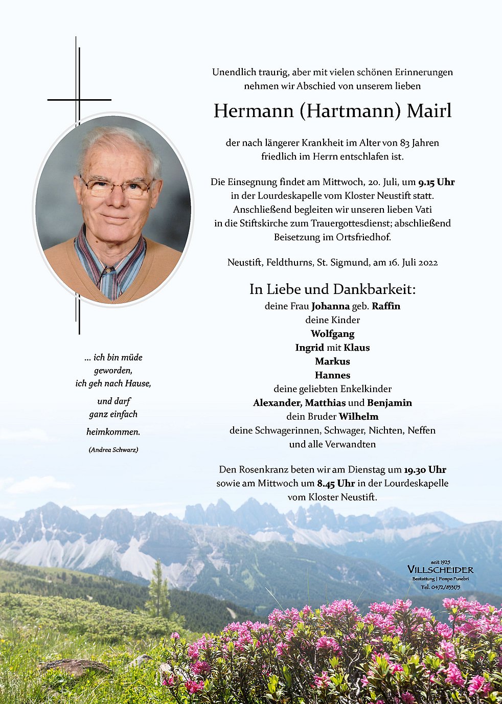 Herr Mairl, Sie waren jahrelang ein geschätzter Mitarbeiter des Milchhofes Brixen. Ich habe Sie als engagierten, integren und pflichtbewussten Mitarbeiter kennenlernen dürfen. Möge Ihnen der Himmel Ihre guten Taten lohnen.Den Angehörigen wünsche ich viel Kraft und Zuversicht in dieser Trauerzeit.