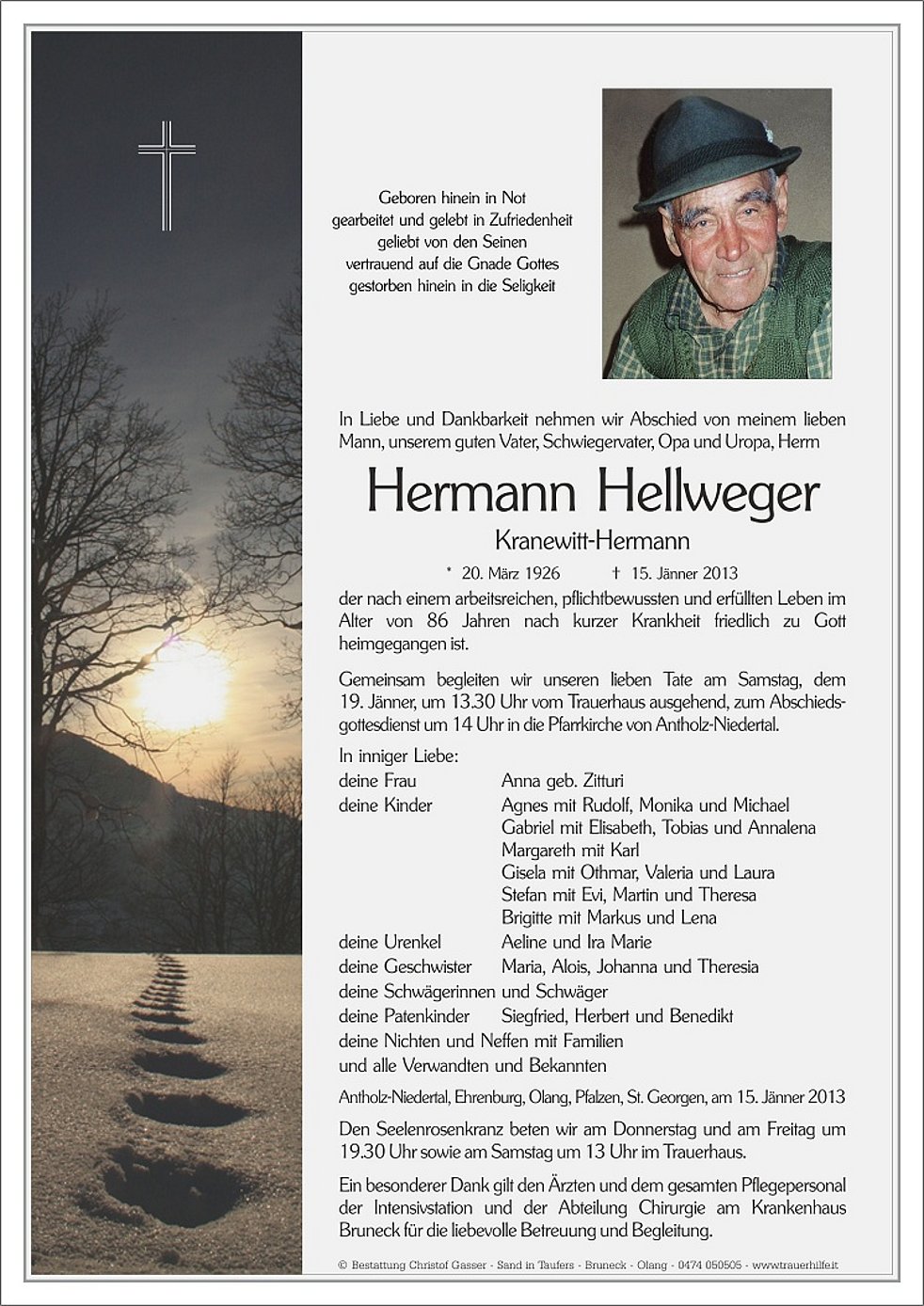 19. Jänner, um 13.30 Uhr vom Trauerhaus ausgehend, zum Abschieds-gottesdienst um 14 Uhr in die Pfarrkirche von Antholz-Niedertal.