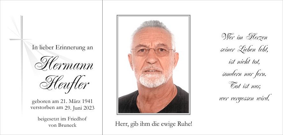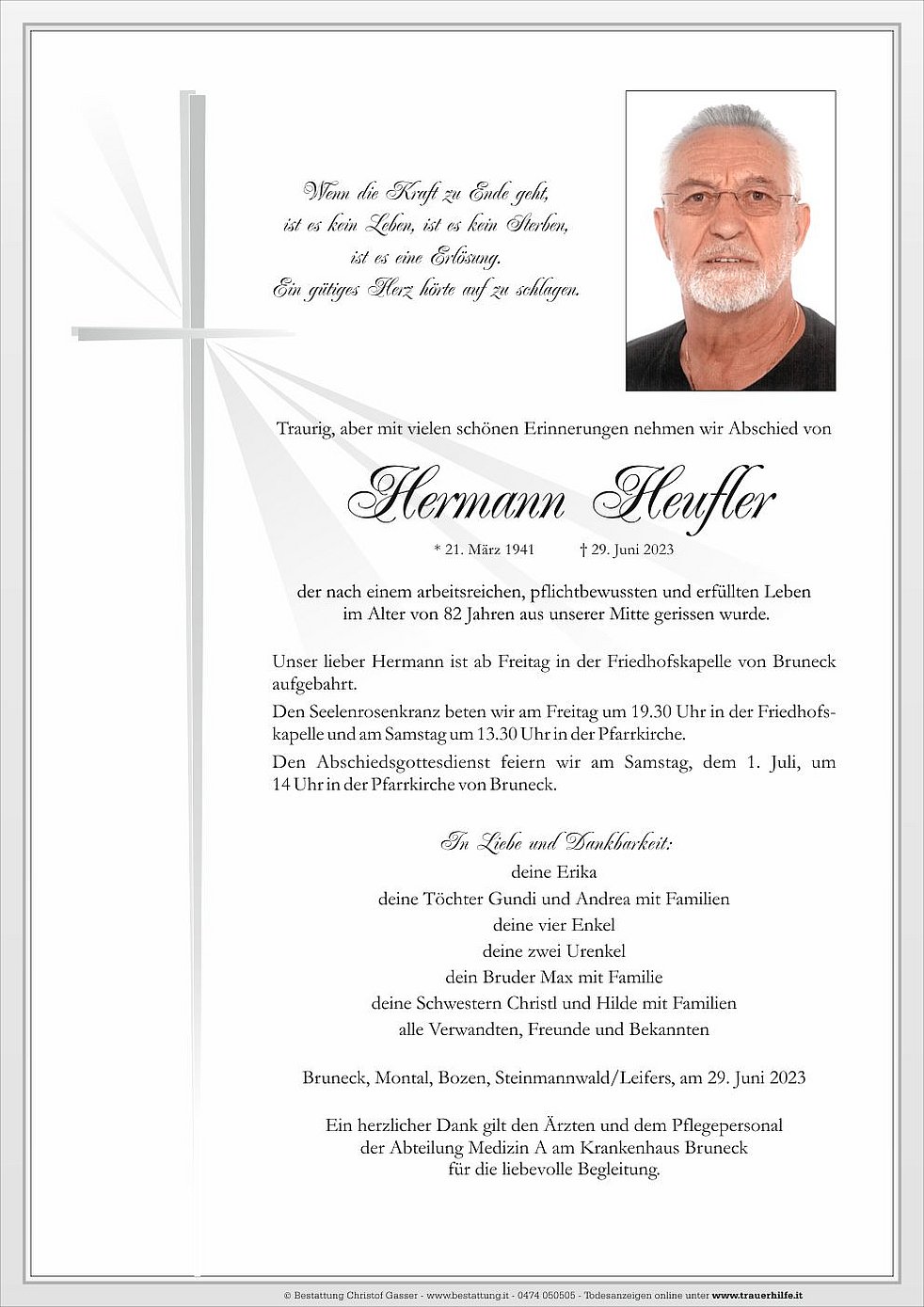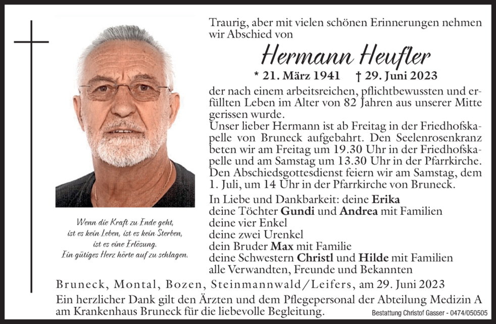 Unser lieber Hermann ist ab Freitag in der Friedhofskapelle von Bruneck aufgebahrt.