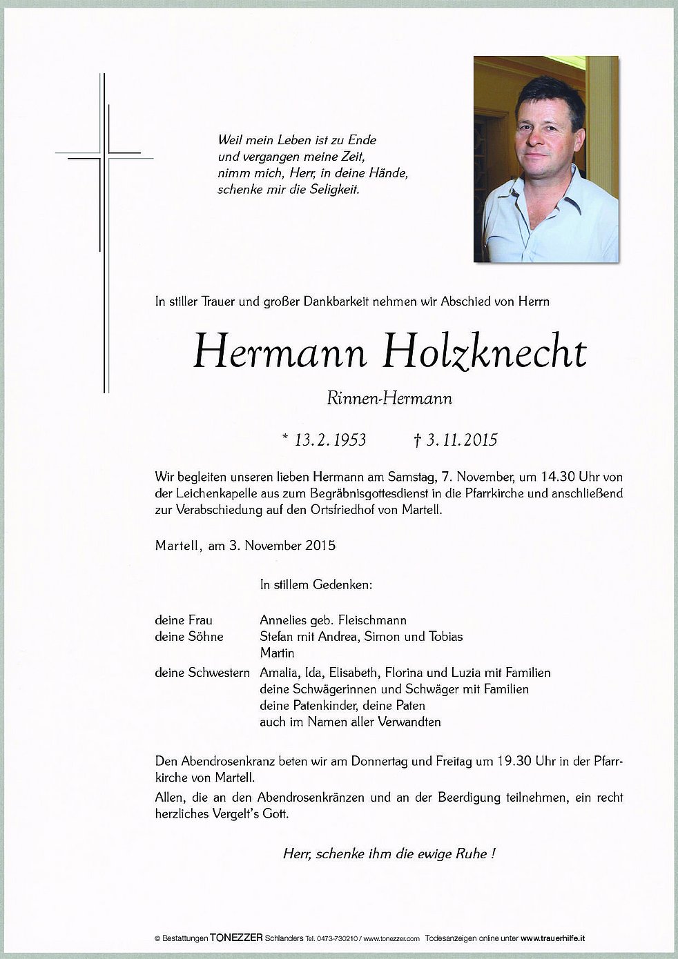 Wir begleiten unseren lieben Hermann am Samstag, 7. November, um 14.30 Uhr von der Leichenkapelle aus zum Begräbnisgottesdienst in die Pfarrkirche und anschließend zur Verabschiedung auf den Ortsfriedhof von Martell.